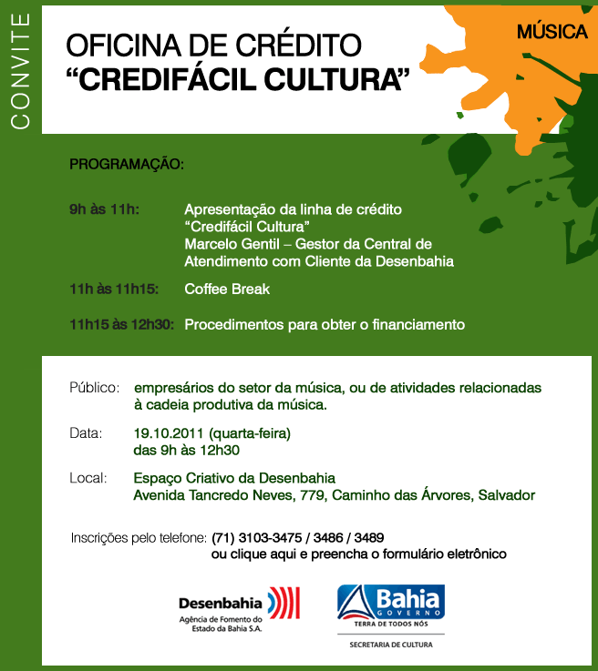 Depois de reunir profissionais do setor audiovisual para informá-los e orientá-los sobre formas de crédito disponíveis para quem quer investir no setor cultural, chega a vez do setor musical ser o foco da OFICINA DE CRÉDITO - CREDIFÁCIL CULTURA, promovida pela Secretaria de Cultura do Estado da Bahia, em parceria com o Desenbahia – Agência de Fomento do Estado da Bahia. A oficina acontece no dia 19 de outubro (quarta), das 9h às 12h30, no Espaço Criativo do Desenbahia.