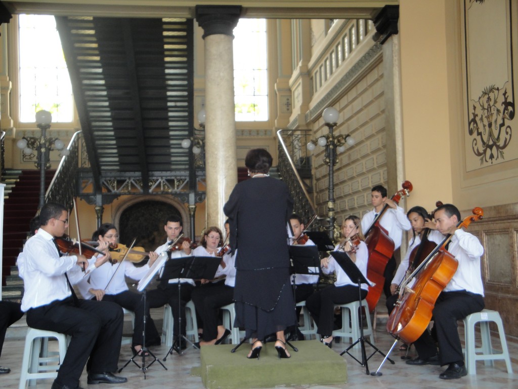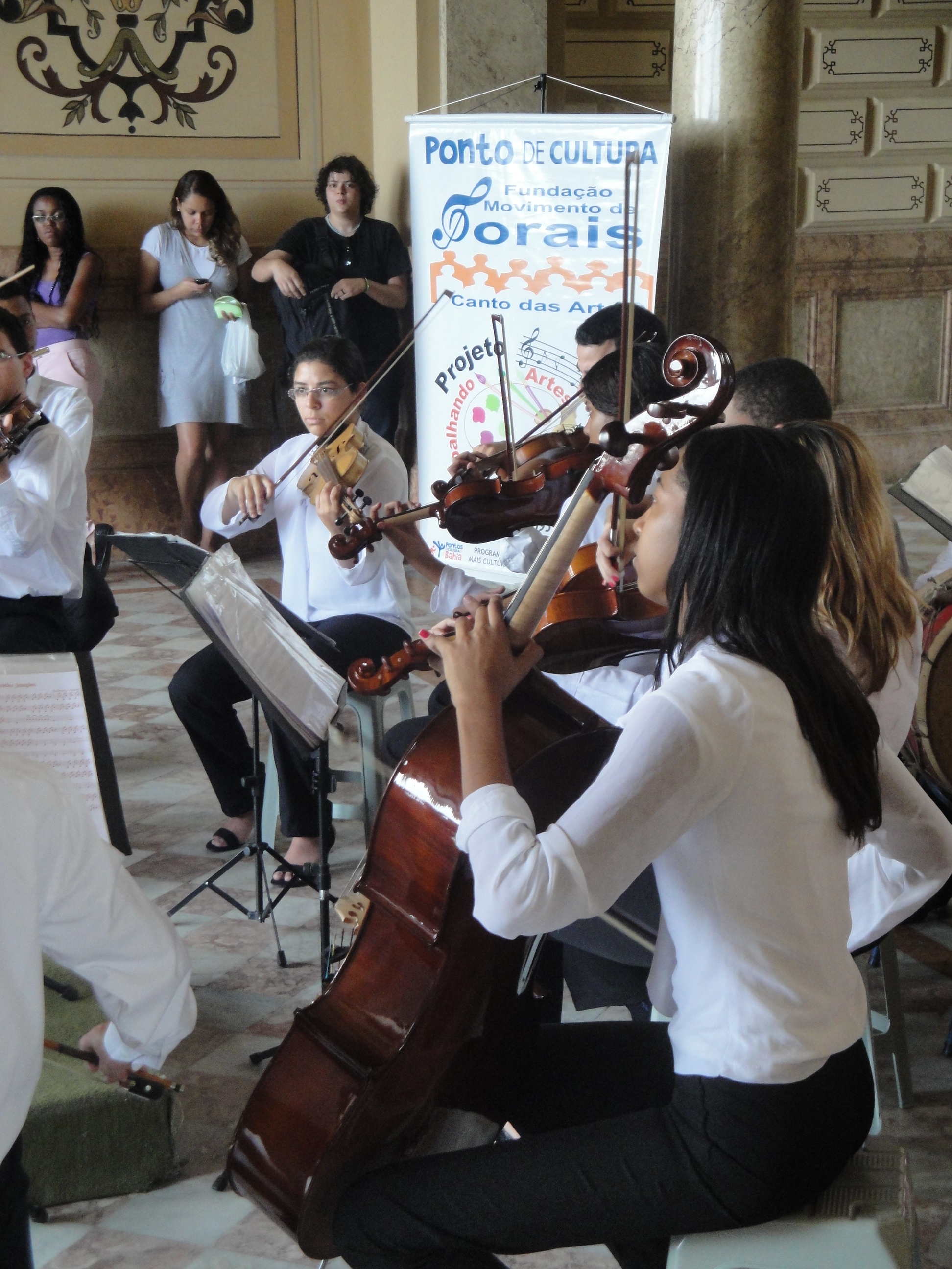 A entrada principal do Palácio Rio Branco, sede da Secretaria de Cultura do Estado (SECULT), foi tomada no início da tarde desta sexta-feira (30.09) pela música melodiosa de violinos, violoncelos e flauta. A apresentação dos jovens da Orquestra de Câmara Canto das Artes, de Itapetinga encantou a todos que passavam pelo local. No repertório, músicas clássicas e outras mais populares.
