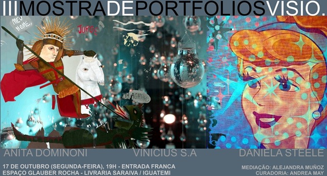 Atelier Coletivo VISIO. e Livraria Saraiva convidam para a III MOSTRA DE PORTFOLIOS a realizar-se na segunda-feira, dia 17 de outubro, às 19h. Esta iniciativa teve início durante o Programa Inverno Astral e, devido à ótima repercussão, vem seguindo um calendário regular sob a curadoria artística de Andrea May e curadoria da Profa. Alejandra Muñoz. Num formato funcional onde cada artista apresenta sua trajetória ou determinado processo criativo durante 30 minutos, esta mostra objetiva sedimentar cada vez mais a pesquisa e a difusão das Artes Visuais em Salvador. O encontro acontecerá na Sala Glauber Rocha da Saraiva Iguatemi e a entrada é franca. Saiba um pouco sobre os artistas convidados para esta edição: Anita Dominoni é baiana, filha de pais argentinos e viveu em Buenos Aires até 2002. Cenógrafa e Caracterizadora Teatral graduada pela Escola de Belas Artes "Ernesto de La Carcova" - do Instituto Universitario del Arte e pelo Instituto Superior de Arte do Teatro Colon, ambos na Argentina. Atuante como Diretora de Arte, ganhou prêmio de Melhor Direção de Arte no 38 Festival de Gramado (2010); Prêmio Júri Técnico do Troféu Cidade de Gramado com o longa metragem "O último romance de Balzac" de Geraldo Sarno. Participou de várias exposições e tem trabalhos publicados no Jornal A TARDE, Revista Muito, Bicentenario Pop para Casa Malpensante (Bogotá, Colombia), Editoral Abril e Editora Mol. http://www.flickr.com/photos/anitadominoni/ Vinícius S.A, 28 anos, baiano. Cursa Artes Visuais na Escola de Belas Artes (UFBA). Em sua curta carreira realizou cinco exposições individuais. A instalação "Lágrimas de São Pedro" o projetou nacionalmente com itinerância por São Paulo, Brasília, Curitiba e Salvador. Participou de diversas exposições coletivas, salões e ações urbanas. Premiado no 15 Salão da Bahia com bolsa/residência na Vrije Academie em Den Haag, Holanda, também recebeu premiações na Bienal do Recôncavo; Edital de ocupação da Caixa Cultural e Salões Regionais de Artes Visuais da Bahia. www.viniciussa.multiply.com Daniela Steele nasceu em Salvador em 1964. Concluiu o curso de Artes Plásticas pela Escola de Belas Artes da UFBA em 1992. Atualmente divide sua vida e trabalho entre as cidades de Salvador, Bahia e do Porto, Portugal. Desde 1991, apresenta com regularidade exposições inclusive no exterior, paralelamente às atividades de curadoria para intercâmbio de artistas brasileiros e estrangeiros, além de trabalhos diversos nas áreas de cenografia e ambientação. www.danielasteelearte.blogspot.com