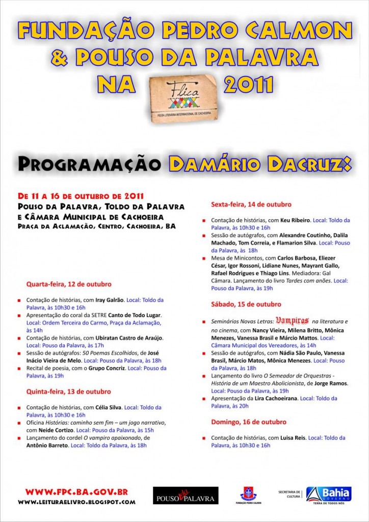 Apoiar e fortalecer os grandes eventos literários da Bahia. Esta é a intenção da Secretaria de Cultura do Estado, por meio da Fundação Pedro Calmon, ao patrocinar a realização da Festa Literária Internacional de Cachoeira - FLICA (com investimentos de R$130 mil) e a 10º Bienal do Livro da Bahia (com recursos da ordem de R$300 mil). Entre os dias 11 e 16 de outubro será realizada a primeira Festa Literária Internacional de Cachoeira (FLICA), que acontecerá na cidade histórica do Recôncavo Baiano. Além dos 33 escritores e 10 especialistas reunidos em mesas de debate e palestras, a Fundação Pedro Calmon reunirá nomes consagrados e revelações da literatura baiana em torno da Programação Damário Dacruz, que homenageia o poeta cachoeirano falecido em 2010. As atividades ocorrerão justamente no espaço criado por ele, o Pouso da Palavra, e ocuparão a Praça da Aclamação em uma estrutura formada por estandes e a presença dos veículos da Biblioteca Móvel. Esse espaço, em praça pública, recebeu o nome de Toldo da Palavra. Haverá ainda atividades na Câmara Municipal dos Vereadores e na Ordem Terceira do Carmo, ambas também localizadas na mesma praça do Pouso da Palavra. Integram a Programação Damário Dacruz: contação de histórias infantis, apresentações musicais, seminário sobre a literatura vampiresca, sessões de autógrafos com autores baianos, além do lançamento dos livros: O Semeador de Orquestras - História de um Maestro Abolicionista, do jornalista Jorge Ramos, e a coletânea de minicontos, Tarde com anões, dos autores Carlos Barbosa, Eliezer César, Igor Rossoni, Lidiane Nunes, Mayrant Gallo, Rafael Rodrigues e Thiago Lins. Toda a Programação Damário Dacruz pode ser conferida no site da Fundação Pedro Calmon ou no site oficial da FLICA.