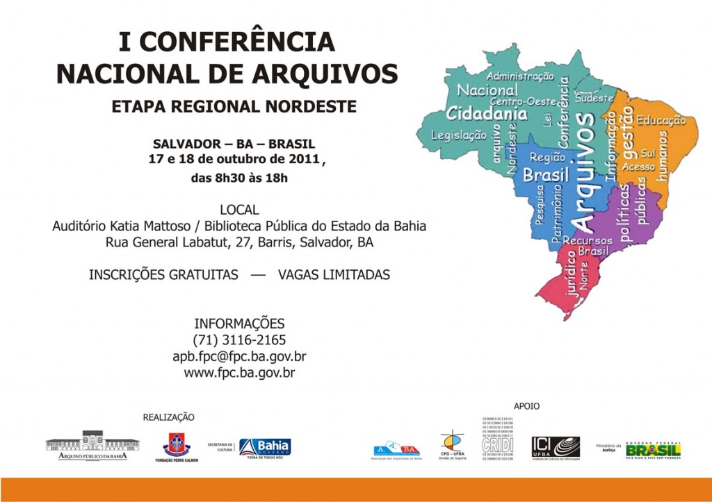 A I CNARQ Etapa Regional NORDESTE se realizará nos dias 17 e 18 de outubro de 2011. O público-alvo constitui-se de: professores, pesquisadores da área de Arquivologia; arquivistas; profissionais de instituições públicas (Executivo, Judiciário e Legislativo) e privadas detentoras de acervos documentais; gestores de documentos; de arquitetura de sistemas de gestão arquivística de documentos; notários (tabeliães); pesquisadores acadêmico-científicos; associados aos Institutos Históricos e Genealógicos de toda a Região Nordeste. Para informações adicionais: (71) 3116-2165.