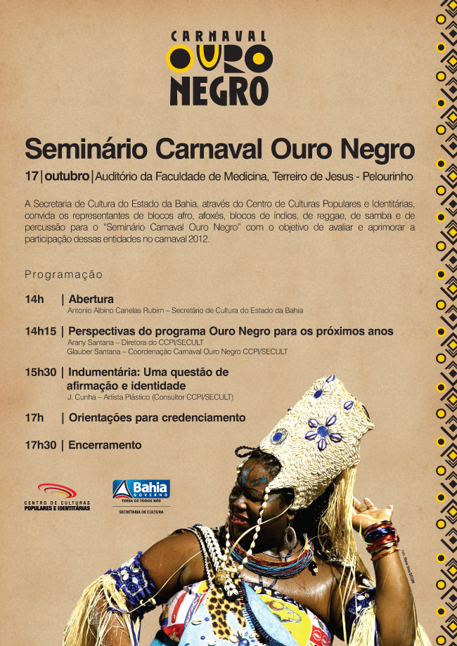 Realizado pelo Governo do Estado da Bahia, através da Secretaria de Cultura, o Carnaval Ouro Negro é um programa de apoio a afoxés, blocos afro, de índios, de samba, de percussão e de reggae. E para avaliar a aprimorar a participação das 140 entidades subsidiadas pelo programa, além de informá-las sobre os próximos passos para os carnavais de 2012 e 2013, o Centro de Culturas Populares e Identitárias, órgão da Secult, irá realizar um seminário sobre o Carnaval Ouro Negro na segunda-feira, 17 de outubro, a partir das 14 horas, na Faculdade de Medicina, localizada no Terreiro de Jesus, Centro Histórico.
