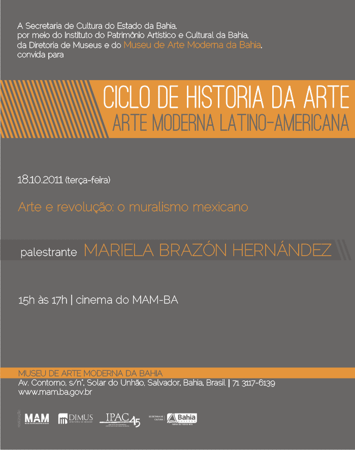 Arte e revolução: o Muralismo Mexicano é o tema da apresentação da professora Mariela Hernández nesta terça-feira (18/10) às 15h, no Cinema do MAM. A fala de Hernández se refere à Arte moderna latino-americana, título do terceiro módulo do Ciclo de História de Arte, que ocorre no Museu de Arte Moderna da Bahia desde o dia 09 de agosto. Com a Revolução Mexicana de 1910, governantes e artistas daquele país deram maior relevância à dimensão ideológica da arte e ao seu potencial no papel de educar e conscientizar a população. Segundo a professora Mariela Hernández, “os muralistas mexicanos foram porta-vozes ativos de valores revolucionários, não apenas no âmbito político como também no artístico”. Os muralistas são artistas que pintam sobre uma parede, seja em uma superfície ou em um painel montado numa exposição permanente. Este tipo de técnica se distingue das outras artes pictóricas devido ao seu vínculo com a arquitetura. Em sua primeira participação no Ciclo de História da Arte, Hernández explicará acerca das características iconográficas do movimento, além de suas escolhas formais e conceituais. O intuito é “compreender a maneira como esses artistas se posicionaram diante da primeira grande revolução social do século XX, destacando o papel vanguardista do Muralismo Mexicano na fase inaugural da modernidade artística latino-americana”, aponta a professora. Mariela Brazón Hernández possui bacharelado em Computação e em História da Arte pela Universidad Central de Venezuela. Sua dissertação de mestrado discutiu sobre a historiografia da arquitetura colonial sul-americana; as relações entre a arte cinética, a física e a matemática foram o tema de sua tese de doutorado, ambos realizados na Universidade Federal do Rio de Janeiro. Após lecionar durante dez anos na Universidad Central de Venezuela, tornou-se professora na Escola de Belas Artes da Universidade Federal da Bahia. Ciclo de História da Arte O Ciclo de História da Arte é divido em três módulos. O primeiro, Modernidade e transição para a contemporaneidade, contou com três participações de Almandrade e uma de Alejandra Muñoz. Espacialidade, ação e discurso na produção artística contemporânea foi o tema da segunda seção de encontros, com as presenças de Alejandra Muñoz, Ludmila Brito e Priscila Lolata. Por fim, Mariela Hernández fará as últimas palestras, referentes à Arte moderna latino-americana.