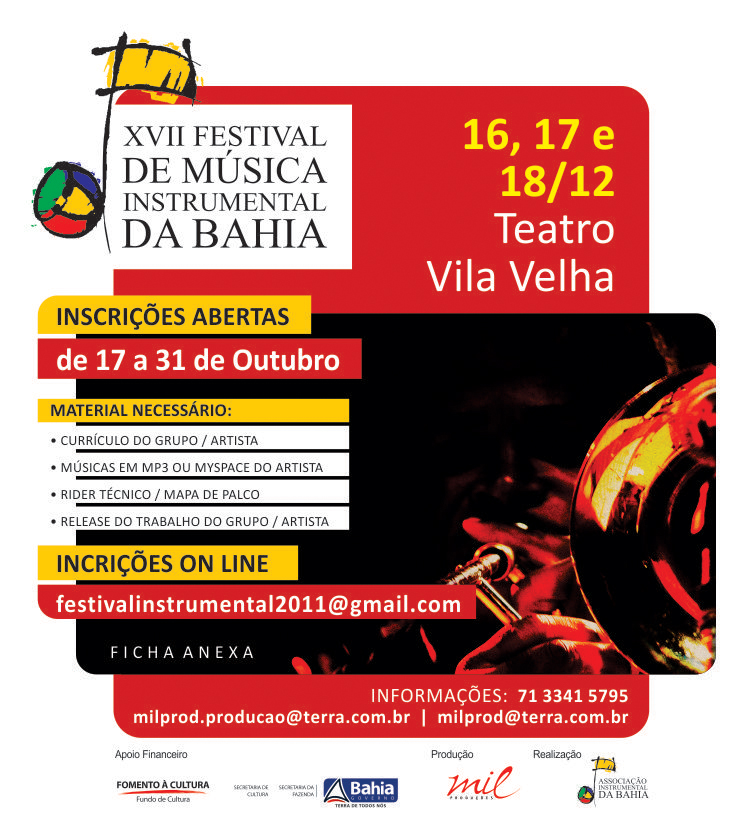 As inscrições para XVII Festival de Música Instrumental têm início na segunda-feira, 17 de outubro, e terminam no dia 31 de outubro. Um dos mais importantes eventos do calendário cultural de Salvador, este ano o Festival será realizado nos dias 16, 17 e 18 de dezembro, no Teatro Vila Velha.