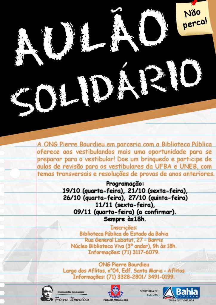Em parceria com a Ong Pierre Bourdieu, a Biblioteca Pública do Estado da Bahia realizará a primeira edição do projeto Aulão Solidário, no qual alunos de colégios públicos e/ou particulares terão a oportunidade de revisar assuntos que serão cobrados nos vestibulares da Universidade Federal da Bahia (Ufba) e Universidade do Estado da Bahia (Uneb). As aulas acontecerão no Quadrilátero (térreo) nos dias 19,21, 26, 27 de outubro e 09*,11 de novembro, sempre às 18h, e serão ministradas por professores que participam do curso pré-vestibular da Ong. Para realizar a inscrição, é necessário comparecer à Ong ou Biblioteca (Núcleo de produção Biblioteca Viva - 3º andar) e preencher a ficha com nome e RG. Como ingresso, o estudante deve trazer um brinquedo novo ou usado para ser doado ao projeto "Educação Cidadã nos Centros Municipais de Educação Infantil", que atende a creches infantis com crianças de 0 a 5 anos em Salvador. Ong Pierre Bourdieu - fundada em 20 de novembro de 1999, a Organização Não-Governamental Pierre Bourdieu é uma entidade sem fins lucrativos formada por profissionais nas áreas de Ciências Sociais, Direito, Administração, História, Estatística, Comunicação, dentre outras devidamente preparadas e conscientes do seu papel social. A proposta da ONG é organizar e promover cursos, conferências, congressos, seminários e debates de caráter científico, educacional, técnico e cultural. Os esforços da Bourdieu se dão através de trabalhos como consultoria educacional, cursos preparatórios para vestibular, oficinas, palestras, seminários, implantação de espaços de leitura e cursos de línguas estrangeiras. *A confirmar. Serviço: Aulas de revisão para os vestibulares UFBA e UNEB O quê: Aulão Solidário Onde: Biblioteca Pública do Estado da Bahia – Barris (Quadrilátero – térreo) Quando: 19,21, 26, 27 de outubro e 09*,11 de novembro, sempre às 18h Quanto: doação de brinquedo novo ou usado para o projeto "Educação Cidadã nos Centros Municipais de Educação Infantil" Contato: (71) 3117-6041 (Biblioteca Viva), 3328-2801 ou 3491-0199 (Ong Pierre Bourdieu Mais informações: www.bibliotecapublicafpc.blogspot.com e http://www.ongpierrebourdieu.com.br/