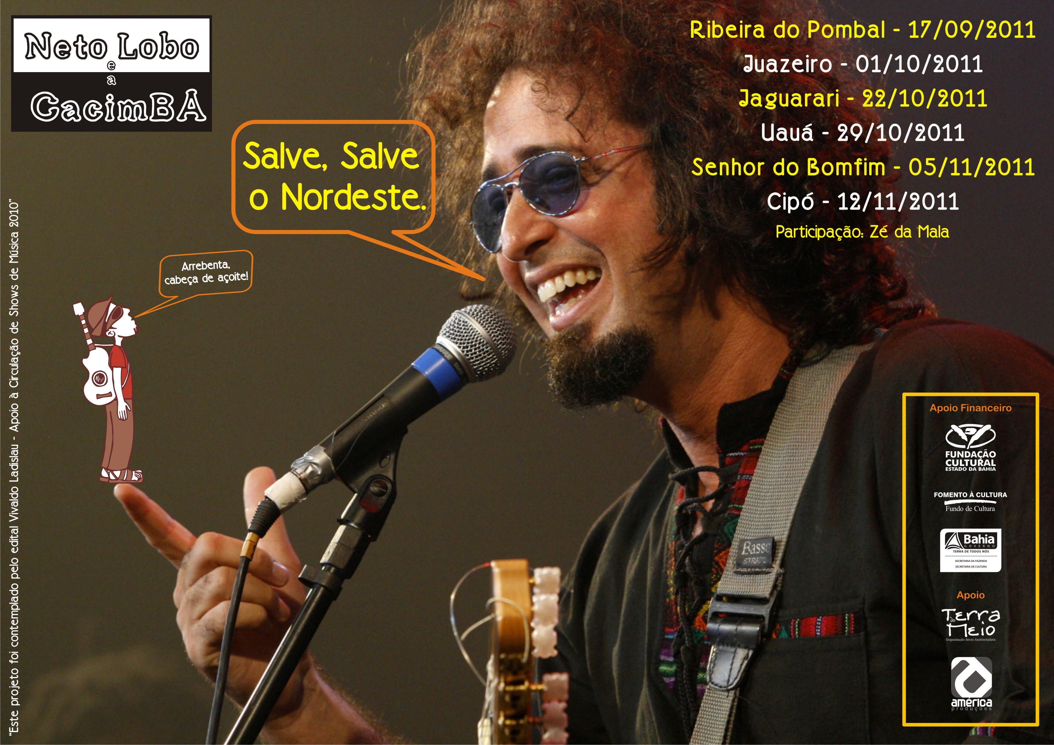 A peleja de Neto Lobo e a Cacimba continua pelo sertão produtivo e semi-árido da Bahia através do projeto Salve, Salve o Nordeste. Diversos ícones nordestinos e suas expressões artísticas serão homenageados no projeto aprovado no Edital de Circulação da Fundação Cultural do Estado da Bahia, unidade da Secretaria de Cultura do Estado (SecultBA). O próximo show será no dia 22 de outubro em Jaguarari, seguido de um em Uauá (29/10), Senhor do Bonfim (05/11) e Cipó (12/11), com a participação do poeta e ator Zé da Mala (Gabriel Bandarra). “O Projeto Salve, Salve o Nordeste é uma singela e sincera homenagem aos grandes mestres nordestinos. Eles enriquecem, perpetuam e divulgam a nossa cultura interiorana”,resume Neto Lobo. Nesses shows, Neto Lobo vem acompanhado por Duda Brandão (guitarra e disco voador), Sidnei Rasta (bateria), Jonatas Fernandes (contrabaixo e vocal) e Tiago Coelho (percussão).