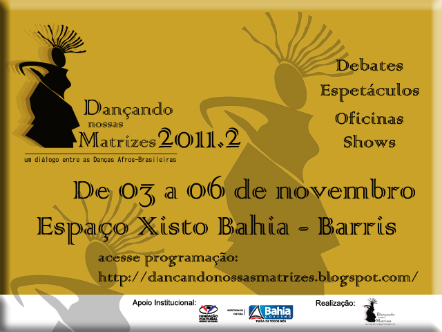 Com o propósito de promover espaços de discussão sobre formação, produção artística, memória e políticas públicas voltadas para as danças afros, o II Encontro Dançando Nossas Matrizes: um diálogo entre as Danças Afros brasileiras acontece entre os dias 3 e 6 de novembro, das 9 às 22 horas, no Espaço Xisto Bahia (Barris – Salvador/BA), com programação inteiramente gratuita. Realizada pelo Coletivo de Professores e Artistas das Danças de Matrizes Africanas (DNM), a iniciativa tem apoio do Calendário de Apoio a Projetos Culturais 2011, mecanismo de incentivo promovido pela Fundação Cultural do Estado da Bahia (FUNCEB), unidade da Secretaria de Cultura do Estado (SecultBA). A programação inclui debates, oficinas de dança, percussão e estética, exposições, intervenções, além de apresentações artísticas, na busca de avaliar as produções e propor políticas públicas que pensem esta modalidade como atividade de cultura corporal, histórica e social. O evento reúne profissionais das diversas linguagens artísticas, pesquisadores, representantes de instituições e do Governo do Estado, estudantes e demais pessoas interessadas em discutir sobre as Danças Afros, seus desdobramentos e necessidades. Dançando Nossas Matrizes reflete ainda sobre a aplicabilidade e as diversas possibilidades de métodos para o ensino da Dança Afro nas escolas e espaços culturais, tendo como ponto de partida a Lei 10.639/2003, que torna obrigatório o ensino de História e Cultura Afro-Brasileira em todas as escolas brasileiras, públicas e particulares, do ensino fundamental até o ensino médio, e inclui o Dia da Consciência Negra no calendário escolar. Nesta perspectiva, a ideia deste segundo encontro é fomentar e difundir as Danças Afros, buscando resultados efetivos para as ações propostas na primeira edição do evento, que, em junho passado, reuniu cerca de 1.300 pessoas. Confira a programação completa no site www.dancandonossasmatrizes.blogspot.com. Sobre o Calendário de Apoio: Criado em 2008 e com quatro edições anuais realizadas, o Calendário de Apoio a Projetos Culturaistem o objetivo de organizar as solicitações de apoio e a distribuição de recursos ao longo do ano, como um mecanismo de incentivo a projetos e atividades artístico-culturais de interesse público. Nas três etapas da edição 2011, o Calendário somou um total de 650 projetos inscritos (324 da Região Metropolitana de Salvador e 326 do interior baiano) e 72 contemplados (33 da Região Metropolitana de Salvador e 39 do interior). Já nas três edições passadas, entre os anos de 2008 e 2010, o Calendário contabilizou um total de 702 propostas e apoiou 146 projetos (108 da capital e 38 de outras cidades), colaborando para a execução de diversas atividades culturais em mais de 30 cidades da Bahia e financiado passagens aéreas para viagens de artistas a outros estados brasileiros e ao exterior. SERVIÇO II Encontro Dançando Nossas Matrizes: um diálogo entre as Danças Afros brasileiras Quando: 3 a 6 de novembro de 2011 (quinta a domingo), 9 às 22 horas Onde: Espaço Xisto Bahia (Rua General Labatut, 27, subsolo da Biblioteca Pública do Estado da Bahia, Barris – Salvador/BA. Tel.:3117-6155/6156) Quanto: Gratuito Realização: Coletivo de Professores e Artistas das Danças de Matrizes Africanas (DNM) Apoio: FUNCEB/ SecultBA