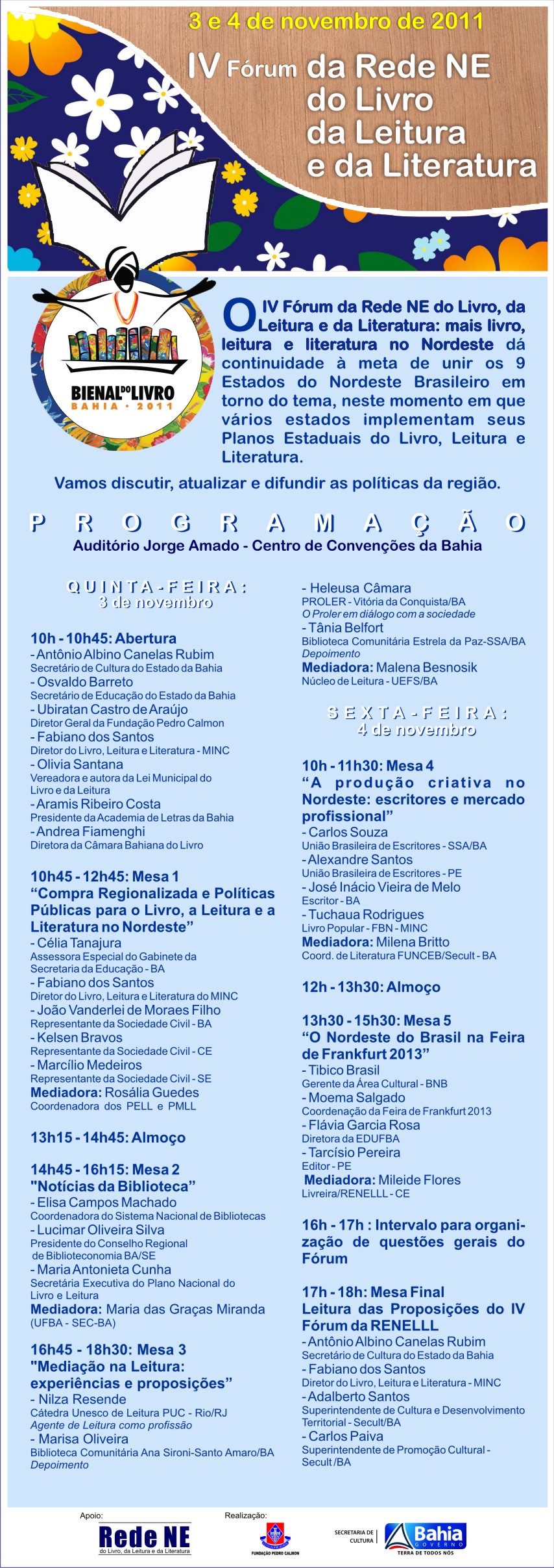Durante a Bienal do Livro será realizado o IV Fórum da Rede Nordeste do Livro, da Leitura e da Literatura, nos dias 3 e 4 de novembro,  no auditório Jorge Amado, que irá discutir os desafios da produção literária baiana e da formação do público leitor, com participação de autores, editoras, escritores, bibliotecários, gestores municipais e estaduais e demais interessados ligados ao mercado editorial dos estados do nordeste. Durante o Fórum, a Fundação Pedro Calmon/SecultBA disponibilizará R$ 50 mil em vales-livro para serem distribuídos a 115 instituições vinculadas às ações de disseminação do livro e da leitura. São cerca de 95 Pontos de Leitura, contemplados pelo Programa Mais Cultura (MinC), 15 Bibliotecas que funcionam em comunidades da religião de matriz africana, mais 4 Espaços de Leitura da Fundação da Criança e do Adolescente do Estado da Bahia (FUNDAC) e ainda a Fundação de Hematologia e Hemoterapia da Bahia (HEMOBA), que irão utilizar os vales na aquisição de livros na X Bienal do Livro da Bahia. O valor é parte dos R$ 530 mil investidos pelo Governo do Estado para aquisição de livros durante o evento.