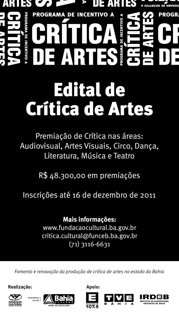 Abertas em 22 de agosto, as inscrições para o Concurso Estadual de Estímulo à Crítica de Artes continuam até 16 de dezembro. Parte do Programa de Incentivo à Crítica de Artes (www.fundacaocultural.ba.gov.br/criticadeartes), da Fundação Cultural do Estado da Bahia (FUNCEB), unidade da Secretaria de Cultura do Estado (SecultBA), o certame vai premiar autores da Bahia de críticas culturais referentes a sete linguagens artísticas: Artes Visuais, Audiovisual, Circo, Dança, Literatura, Música e Teatro. Em cada uma destas categorias, haverá três premiados: 1º lugar (R$ 3,2 mil), 2º lugar (R$ 2,3 mil) e 3º lugar (R$ 1,4 mil), contabilizando um investimento total de R$ 48,3 mil em premiações. O período de quase quatro meses para apresentação de propostas, prazo mais longo que o comumente aplicado, objetiva oportunizar o tempo necessário à mobilização social diante desta produção artístico-intelectual, cuja tradição, atividade, empregabilidade e reconhecimento são pouco suficientes na Bahia. O Programa de Incentivo à Crítica de Artes se justifica pela importância da crítica para o fortalecimento da produção artística, a qualificação de profissionais da área e o progresso do posicionamento do público perante aquilo que as artes lhe proporcionam, para a consolidação de um ambiente social propício ao acolhimento devido do setor da Cultura. Assim, a ideia é contribuir para o desenvolvimento das artes do estado e da percepção analítica dos cidadãos baianos através da formação, qualificação e estímulo de críticos. Nesta perspectiva, outra ação já realizada pelo Programa de Incentivo à Crítica de Artes foi o I Seminário Baiano de Crítica de Artes, que ocorreu entre 19 e 23 de setembro, na Sala Walter da Silveira, em Salvador, reunindo profissionais de grande experiência na área de crítica cultural e crítica específica nas linguagens artísticas – entre eles, José Miguel Wisnik e Ruy Gardnier. O evento foi aberto ao público, com entrada franca, e teve transmissão on line ao vivo pelo Portal do IRDEB (www.irdeb.ba.gov.br), ampliando o acesso aos conteúdos por pessoas do interior do estado e de todo o país. Mais de 8.700 visitas de internautas foram registradas, contabilizando um total de 30.589 visualizações de página. INSCRIÇÕES – Os proponentes devem apresentar duas críticas inéditas: uma sobre um produto cultural baiano e outra de livre escolha. Para participar, é preciso ser maior de idade, brasileiro nato ou naturalizado, domiciliado na Bahia, ou estrangeiro com situação de permanência legalizada e residência no estado. O texto do edital, bem como seus anexos e uma lista de obras, por linguagem, que pode ser usada como referência para a produção das críticas, está disponível no site da FUNCEB (www.funceb.ba.gov.br). Concurso Estadual de Estímulo à Crítica de Artes Período de inscrições: Até 16 de dezembro de 2011 Inscrições presenciais: Na FUNCEB (Rua Gregório de Mattos, 29, Pelourinho, Salvador/BA) De segunda a sexta-feira, das 14 às 18 horas Inscrições via postal: Unicamente através do serviço Sedex com Aviso de Recebimento/AR, encaminhadas para: FUNDAÇÃO CULTURAL DO ESTADO DA BAHIA – CAIXA POSTAL 2485, CEP 40.020-970, Salvador – Bahia. Site: www.fundacaocultural.ba.gov.br/criticadeartes E-mail: critica.cultural@funceb.ba.gov.br Telefone: 71 3116-6836 Realização: FUNCEB/ SecultBA