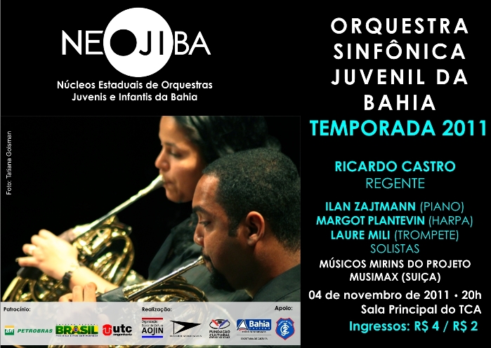 A apresentação terá como solistas convidados o pianista de apenas 10 anos de idade, Ilan Zajtmann, executando o “Concerto para piano n° 1”, de Ludwig van Beethoven, a harpista Margot Plantevin (13 anos), tocando a versão para Harpa do Concerto de Aranjuez, de Joaquin Rodrigo, e a trompetista Laure Mili (12 anos), executando o “Concerto para trompete”, de Alexander Arutunian. O contrabaixista Samuel Khatchatourian, de 13 anos, também do MUSIMAX, integrará a orquestra durante a apresentação que incluirá, entre outras obras, o famoso Bolero de Ravel. O sétimo concerto da Temporada 2011 da Orquestra Sinfônica Juvenil da Bahia conta com o patrocínio da Petrobras, Governo Federal e UTC Engenharia.