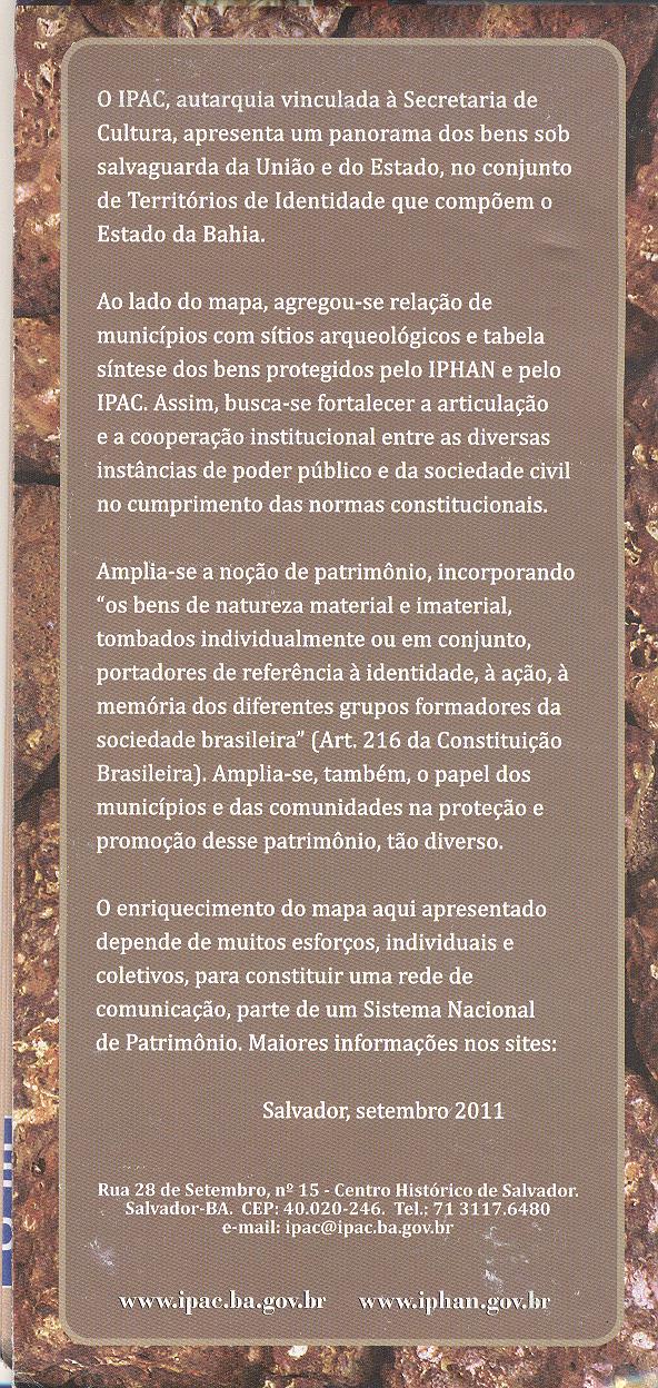 Instituto do Patrimônio Artístico e Cultural da Bahia (IPAC), da Secretaria de Cultura do Estado (Secult), lança neste sábado, dia 5 (novembro, 2011), a partir das 9h, na Faculdade de Arquitetura da Universidade Federal da Bahia (UFBA), no bairro da Federação, em Salvador, edição revista dos Patrimônios Culturais da Bahia 2011. Em formato de folder dobrável, essa é mais uma publicação do IPAC que reúne todos os bens culturais, materiais e imateriais da Bahia protegidos por meio de notificações, registros ou tombamentos, sejam pelos governos estadual ou federal. O lançamento marca o Dia Nacional da Cultura que transcorre no sábado (5), integra a programação comemorativa pelos 45 anos de fundação do IPAC que se encerra em setembro de 2012 e faz parte da conferência setorial sobre Patrimônio e Urbanismo promovida pela Secult, com duas mesas temáticas: Arquitetura e Urbanismo, e Patrimônio Cultural. Já confirmaram presença arquitetos, urbanistas, professores pesquisadores, técnicos estaduais e municipais, e autoridades como o superintendente do Instituto do Patrimônio Histórico e Artístico Nacional (Iphan) na Bahia, Carlos Amorim. O folder Patrimônios Culturais da Bahia 2011 foi a primeira publicação da história do nosso estado a reunir, de uma só vez, todos os patrimônios reconhecidos por decreto – estaduais e federais – como bens culturais da Bahia. O folder vem sendo distribuído em cidades do interior do estado durante os encontros territoriais da Secult, mas somente agora ganha o seu lançamento na capital baiana. De acordo com o diretor geral do IPAC, Frederico Mendonça, o Instituto tem obrigação regimental de divulgar e promover a produção técnica e científica com a qual trabalha e colaborar na formulação da política de educação patrimonial. “Com o folder, reunimos os principais dados sobre a salvaguarda cultural na Bahia e cumprimos essa meta”, esclarece Mendonça. O IPAC finaliza ainda outra publicação a ser distribuída na 4ª Conferência de Cultura da Bahia que acontecerá entre 30 de novembro e 03 de dezembro na cidade de Vitória da Conquista. “Esta outra publicação traz uma síntese das principais instruções para que os Municípios baianos criem suas próprias políticas públicas de preservação do patrimônio cultural, com implantação de legislações próprias, conselhos, fundos e secretarias de cultura”, diz Mendonça. “Esses produtos ajudam os cidadãos e auxiliam aos gestores públicos. Mas o primeiro passo é conhecermos a riqueza e a importância da nossa história e do patrimônio cultural para podermos preservá-lo”, alerta Mendonça. Desde 2007 o IPAC lança folders, livros e documentários em DVD sobre bens culturais baianos. Além de destinados a eventos e instituições culturais, esses produtos são distribuídos em escolas e bibliotecas para ações educativas. “Ao difundirmos dados, mapas, folders, documentários e cursos com especialistas, possibilitamos a salvaguarda e difusão efetiva desse bem cultural que passa a ser mais conhecido pelas futuras gerações”, explica o diretor do IPAC. Já foram lançados livros sobre a Festa da Boa Morte, em Cachoeira, Festa de Santa Bárbara em Salvador, Carnaval de Maragojipe, nessa cidade, além do Desfile dos Afoxés e o Pano da Costa. O encontro setorial de sábado (5) é mais uma etapa para compor a 4ª Conferência em Vitória da Conquista. A sociedade civil contribui na discussão para construção das políticas públicas. O objetivo é reunir os subsídios para instruir as ações governamentais e a construção do Plano Estadual de Cultura. Mais informações sobre as conferências estão no blog http://culturabahia.com. Outros dados sobre o IPAC/Secult nos siteswww.ipac.ba.gov.brwww.cultura.com.br.