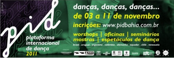 Workshops, oficinas, seminários, mostras e espetáculos de dança. Tudo isso acontece na Plataforma Internacional de Dança (PID) 2011. São nove dias de programação, de 03 a 11 de novembro, com 13 espetáculos e artistas de alguns países, como Uruguai, Colômbia, Argentina, Equador, Chile e Alemanha. O acesso para as atividades é feito de maneira gratuita. A PID é composta pela terceira edição do Seminário de Economia da Dança, pela terceira edição das Jornadas sobre Curadoria para Dança e pelo workshop Diálogo Mestiço: dança contemporânea e outras áreas de conhecimento, com uma construção de conhecimento que abrange para diversas áreas, como gestão, comunicação e produção. Mais informações: MAM/BA