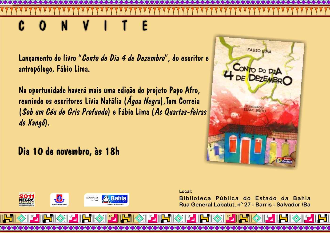 Nesta quinta-feira, dia 10 de novembro o escritor Fábio Lima lança e autografa seu mais novo livro, Conto do dia 4 de dezembro, na Biblioteca Pública do Estado – Barris, na Programação do Novembro Negro da Fundação Pedro Calmon/SecultBA.