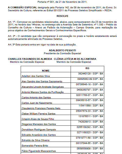 A COMISSÃO ESPECIAL designada pela Portaria 142, de 08 de novembro de 2011, do Exmo. Sr. Secretário de Cultura, referente ao Edital 001/2011 do Processo Seletivo Simplificado – REDA, resolve convocar os candidatos relacionados, no arquivo abaixo, para comparecerem dia 23 de novembro de 2011, no horário das 14h, no endereço Avenida Sete de Setembro, nº 1.330 – Prédio do Conselho de Cultura – Anexo ao Palácio da Aclamação – Campo Grande, para realização da prova objetiva de Conhecimentos Gerais e Conhecimentos Específicos.