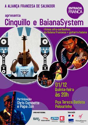 A Aliança Francesa de Salvador promove um encontro musical entre o ritmo afro-caribenho da Guiana Francesa, representada pela banda Cinquillo e pelas participações dos cantores Chris Combette e Papa Zon, e a musicalidade afro-baiana, representada pelo BaianaSystem, que explora as possibilidades da guitarra baiana, ao lado de referências eletrônicas, o dub, hip hop, dancehall. O encontro promete esquentar a temperatura do verão que já se anuncia, na próxima quinta-feira, dia 1º de dezembro, às 20h, no Largo Tereza Batista (Pelourinho – Centro Histórico). Nesta apresentação única, os artistas mostrarão um pouco de suas pesquisas, calcada na música tradicional caribenha e baiana, apontando para o surgimento de novas possibilidades sonoras. O Cinquillo une a música crioula e propõe uma fusão entre a música contemporânea e a tradicional. Entre suas referências estão os ritmos originais africanos, presentes na América do Sul e da costa caribenha. O público baiano poderá conhecer as diversas composições crioulas, que marcam as canções do grupo, que emprega instrumentos como o tambor tradicional e a percussão. As participações de Chris Combette e Papa Zon, cantores nativos da Guiana Francesa enriquecerão a apresentação. Chris Combette agrega as identidades do Caribe, da América do Sul e da Europa à seu repertório musical, composto das sonoridades que formam o repertório crioulo: biguine, mazurka, zouk, salsa, calypso, reggae e bossa nova. Em crioulo, francês, espanhol ou inglês, suas músicas e melodias versam ao som da mistura e formam uma “alquimia de culturas”, que conferem à suas composições uma harmonia peculiar. som da Burkina Faso - Já Papa Zon é músico nascido em Bobo- Dialousso, na Burkina Faso. O artista é filho de dois Griôs, membros de uma casta responsável pela manutenção de um registro oral da história tribal em forma de música, poesia e contação de história. Mudou-se para Montreal no Canadá em 1997. Sua especialidade é misturar a música tradicional da África Ocidental com reggae, Rumba e soukouss, oferecendo ao público um desempenho unplifting. Ao longo dos anos, ele desenvolveu uma grande experiência, colaborando com grandes mestres da música africana local e internacional (Habib Koité, Rachid Taha) e com alguns artistas norte-americanos, Les Colosc, Richard Desjardins, Lynda Lemay e Charles Gregory. Papa Zon toca todos os estilos de instrumentos de percussão, violão e guitarra, além do Koran e Balafon que são seus principais de instrumentos de trabalho. As novas possibilidades sonoras da guitarra baiana, instrumento popularizado pelo Carnaval, em diálogo com outras referencias musicais são marcas da identidade da BaianaSystem, expoente no cenário baiano. Há dois anos o grupo produz uma música urbana com influências das culturas brasileira, africana e jamaicana. BaianaSystem tem um formato que possibilita diversas combinações, “sistemas”. Com isso, amplia a ideia de sound system`s para novas timbragens, estéticas e formações musicais. A base do grupo, no entanto, vem sendo preparada pelo núcleo formado pelo guitarrista Robertinho Barreto, o vocalista Russo Passapusso, o baixista e também produtor do disco Marcelo Seco, o percussionista Wilton Batata e o DJ/Produtor Chico Corrêa (bases e mixdubs).