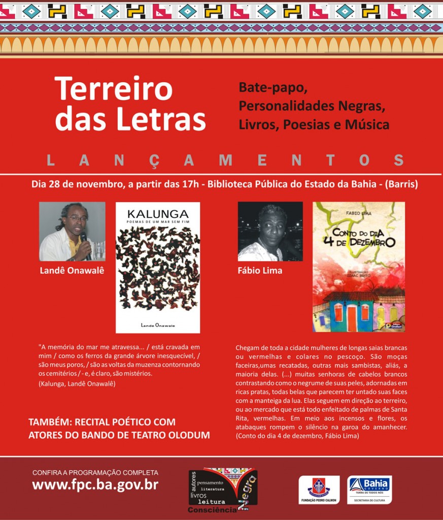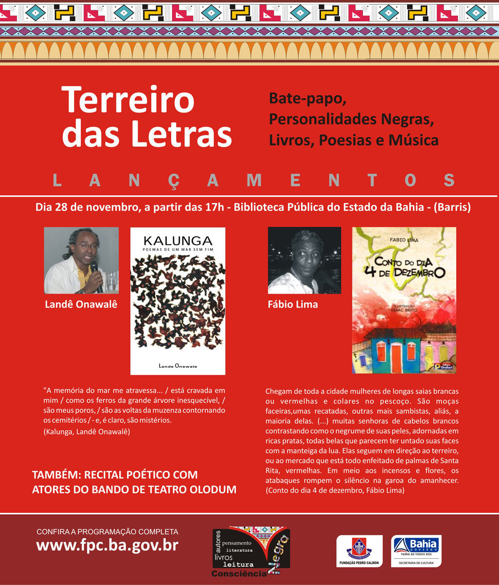 Dois importantes escritores negros da Bahia estarão reunidos para lançamento coletivo de suas mais recentes produções. No dia 28 de novembro, a partir das 17h, a Biblioteca Pública do Estado (Barris), será palco para o lançamento das obras: Kalunga – poemas do mar sem fim, de Landê Onawalê e Conto do dia 4 de dezembro, do escritor Fabio Lima. É o projeto Terreiro das Letras, que marcará o encerramento do Novembro Negro da Fundação Pedro Calmon/SecultBA com recital poético, bate papo com personalidades negras e apresentações musicais do grupo Opanijé e o reggaeman Lazzo Matumbi. A sessão de autógrafos de Landê Onawalê e Fabio Lima contará com a participação de atores do Bando de Teatro Olodum, que vão fazer um recital homenageando poetas da literatura negra.
