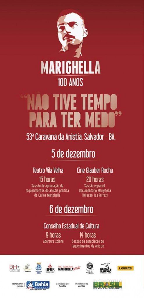 A 53ª Caravana da Anistia estará em Salvador na próxima semana para celebrar o Centenário de nascimento de Carlos Marighela – militante morto pela Ditadura Militar, em 1969. A homenagem é travestida de importante ação política. Na ocasião, serão anistiados sete baianos (lista abaixo), entre eles Juvenal, da famosa barraca de Itapuã. O evento é uma promoção do Ministério da Justiça em parceria com a Secretaria de Cultura do Estado. A programação se divide em dois dias: no dia 5 de dezembro (segunda-feira), às 15h, acontece uma sessão de apreciação de requerimentos de anistia política de Carlos Marighela. Às 20h, no Cine Glauber Rocha, no Espaço Cultural Unibanco, na Praça Castro Alves, será exibido, em sessão especial, o documentário Marighella, de Isa Ferraz. No dia 6 de dezembro (terça-feira), as atividades serão retomadas, a partir das 9h, no Conselho Estadual de Cultura. Às 14h, acontece Sessão de Apreciação de Requerimentos da Anistia. Neste momento serão anunciados os baianos anistiados. São eles: Juvenal Silva Souza, Lourival Gusmão, Edvaldo Dias, Delmiro Martinez Baqueiro, Manoel Barreto da Rocha Neto, Luiz Carlos Barbosa Costa, Sinval Araújo de Andrade, Lucia Maria Pereira de Andrade, Nilton Jorge Kosminsky, Evan Felipe de Souza, Edmundo Dias de Farias, Jairo Cedraz de Oliveira, Luiz Carlos Café da Silva, Aristiliano Soeira Braga, Lourival Soares Gusmão, Josafá Costa Miranda, Tânia Aarão Reis, Mário Barbate e Wesley Macedo de Almeida, natural de Jequié, hoje sofrendo graves transtornos mentais em função da tortura. O evento é aberto ao público. “Marighella foi um revolucionário importante na luta contra a ditadura no Brasil. Membro do Partido Comunista e depois da ALN, foi preso diversas vezes e acabou sendo brutalmente assassinado em 1969, em São Paulo. Foi um ícone de luta contra a Ditadura, um grande homem, que deu a vida pelo seu ideal”, declarou Ana Guedes, da direção do Grupo Tortura Nunca Mais na Bahia e da Comissão Nacional da Anistia. BIOGRAFIA Carlos Marighella nasceu em Salvador, Bahia, em 5 de dezembro de 1911. Era filho de imigrante italiano com uma negra descendente dos haussás, conhecidos pela combatividade nas sublevações contra a escravidão. De origem humilde, ainda adolescente despertou para as lutas sociais. Aos 18 anos iniciou curso de Engenharia na Escola Politécnica da Bahia e tornou-se militante do Partido Comunista, dedicando sua vida à causa dos trabalhadores, da independência nacional e do socialismo. Conheceu a prisão pela primeira vez em 1932, após escrever um poema contendo críticas ao interventor Juracy Magalhães. Libertado, prosseguiria na militância política, interrompendo os estudos universitários no 3o ano, em 1932, quando deslocou-se para o Rio de Janeiro. Em 1o de maio de 1936 Marighella foi novamente preso e enfrentou, durante 23 dias, as terríveis torturas da polícia de Filinto Müller. Permaneceu encarcerado por um ano e, quando solto pela “macedada” – nome da medida que libertou os presos políticos sem condenação -- deixou o exemplo de uma tenacidade impressionante Transferindo-se para São Paulo, Marighella passou a agir em torno de dois eixos: a reorganização dos revolucionários comunistas, duramente atingidos pela repressão, e o combate ao terror imposto pela ditadura de Getúlio Vargas. Voltaria aos cárceres em 1939, sendo mais uma vez torturado de forma brutal na Delegacia de Ordem Política e Social (DOPS) de São Paulo, mas se negando a fornecer qualquer informação à polícia. Na CPI que investigaria os crimes do Estado Novo o médico Dr. Nilo Rodrigues deporia que, com referência a Marighella, nunca vira tamanha resistência a maus tratos nem tanta bravura. Recolhido aos presídios de Fernando de Noronha e Ilha Grande pelo seis anos seguintes, ele dirigiria sua energia revolucionária ao trabalho de educação cultural e política dos companheiros de cadeia. Anistiado em abril de 1945, participou do processo de redemocratização do país e da reorganização do Partido Comunista na legalidade. Deposto o ditador Vargas e convocadas eleições gerais, foi eleito deputado federal constituinte pelo estado da Bahia. Seria apontado como um dos mais aguerridos parlamentares de todas as bancadas, proferindo, em menos de dois anos, cerca de duzentos discursos em que tomou, invariavelmente, a defesa das aspirações operárias, denunciando as péssimas condições de vida do povo brasileiro e a crescente penetração imperialista no país. Com o mandato cassado pela repressão que o governo Dutra desencadeou contra o comunistas, Marighella foi obrigado a retornar à clandestinidade em 1948, condição em que permaneceria por mais de duas décadas, até seu assassinato. O endurecimento do regime militar, a partir do final de 1968, culminou numa repressão sem precedentes. Marighella passou a ser apontado como Inimigo Público Número Um, transformando-se em alvo de uma caçada que envolveu, a nível nacional, toda a estrutura da polícia política. Na noite de 4 de novembro de 1969 – há exatos 30 anos -- surpreendido por uma emboscada na alameda Casa Branca, na capital paulista, Carlos Marighella tombou varado pelas balas dos agentes do DOPS sob a chefia do delegado Sérgio Paranhos Fleury.