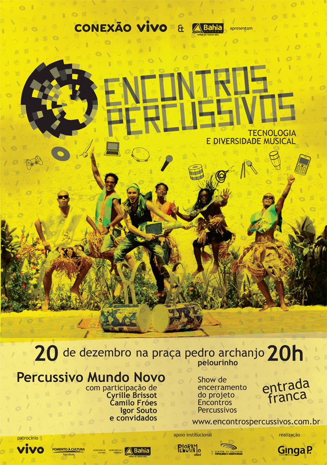 A banda Percussivo Mundo Novo, liderada pelo músico e produtor Mikael Mutti, encerra o projeto “Encontros Percussivos – Um Diálogo Entre Tecnologia e a Diversidade Musical”, com um show com convidados especiais no Largo Pedro Arcanjo no Pelourinho, terça-feira dia 20 de dezembro. Encontros Percussivos é realizado pela Ginga P. Culture Business e integra a Conexão Vivo, iniciativa voltada ao desenvolvimento do setor musical brasileiro, e tem o patrocínio da Vivo e do Governo do Estado da Bahia através do Faz Cultura. Este show no Pelourinho também tem o apoio do Pelourinho Cultural e do Centro de Culturas Populares e Identitárias.