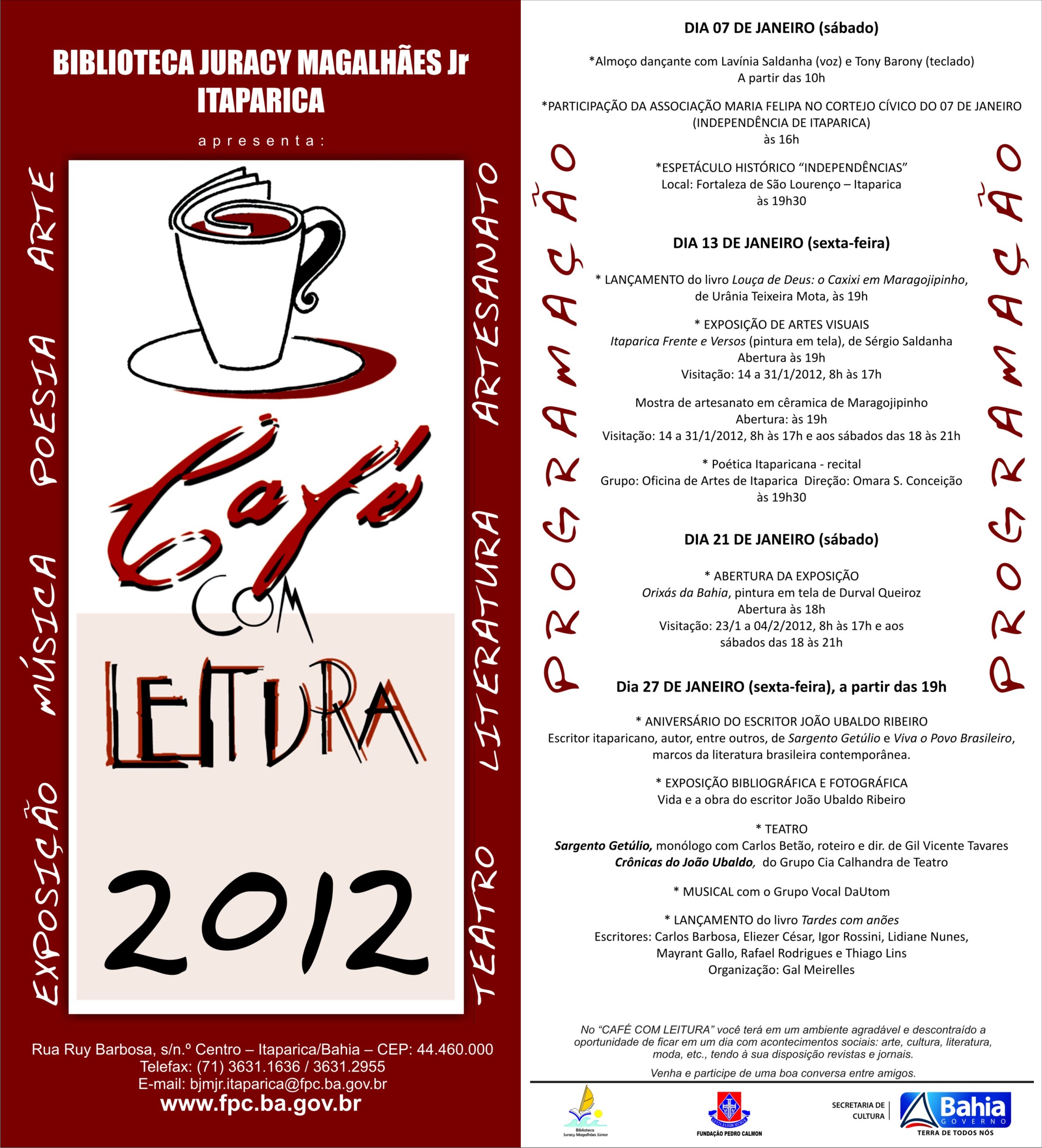 Mais um verão e a Biblioteca Juracy Magalhães Jr. realizará o Projeto Café com Leitura, durante o mês de janeiro de 2012. Nos dias 07, 13, 21 e 27, a partir das 18h, a Ilha de Itaparica, além de opções de lazer e praia, se tornará local de leitura e diversão. Os festejos começam com o tradicional Cortejo Cívico dia 7 de janeiro, data que marca a participação dos itaparicanos nas lutas pela Independência da Bahia. Haverá também lançamentos de livros, espetáculos, mostras de artesanato, exposições, música e a comemoração ao aniversário do escritor João Ubaldo Ribeiro, com exposição, música e teatro em homenagem ao ilustre filho da cidade. Programação – Além do almoço dançante que abre o projeto Café com Leitura, no dia 7 de janeiro, a partir das 10h, a programação ainda reserva ao público o tradicional Cortejo da Independência de Itaparica, com a participação da Associação Maria Felipa. É neste dia que Itaparica comemora sua independência. Em 1823, o pequeno exército concentrado na então Vila de Itaparica, formado majoritariamente de populares –caboclos, negros e mestiços – deteve o desembarque dos portugueses, dificultando consideravelmente a manutenção da hegemonia portuguesa na Bahia. A cada ano, promove-se então uma série de manifestações cívicas e religiosas, destacando-se a apresentação dos caboclos no centro histórico. À noite, o espetáculo histórico “Independências” contará esses fatos com performances artísticas no Forte de São Lourenço. Já no dia 13 (sexta-feira), serão abertas a exposição Itaparica Frente e Versos (pintura em tela) e a mostra de artesanato em cerâmica de Maragojipinho. À noite, às 19h será lançado o livro Louça de Deus: o caxixi em Maragojipinho de Urânia Teixeira Mota, que venceu o edital de apoio à edição de livros de autores baianos da Fundação Pedro Calmon/SecultBA, financiado com recursos do Fundo Cultura da Bahia. O livro é um marco identitário das artes populares nas áreas do Recôncavo e o Baixo Sul e o artesanato marca a perpetuação de dinastias de oleiros. Louça de Deus é um verdadeiro inventário dos principais oleiros de Maragogipinho, recheado com episódios que resgatam a memória oral da cultura popular baiana. Após o lançamento, às 19h30, será realizado o recital Poética Itaparicana, com a Oficina de Artes de Itaparica. No dia 21 de janeiro será a abertura da exposição Orixás da Bahia, pintura em tela do artista itaparicano Durval Queiroz, a partir das 18h. Aniversário - E no dia 27, último dia de programação do Café com Leitura, haverá a comemoração ao aniversário de João Ubaldo Ribeiro, com exposição bibliográfica e fotográfica do escritor intitulada Vida e obra do escritor João Ubaldo Ribeiro. Autor de clássicos da literatura contemporânea como Viva o povo Brasileiro. Será apresentado também um monólogo dirigido e adaptado por Gil Vicente Tavares e estrelado pelo ator baiano Carlos Betão, Sargento Getúlio, que conta a trajetória de um sargento sergipano que tem a missão de transportar um inimigo político de seu chefe. A história é narrada pelo próprio sargento, que no caminho pelo sertão nordestino vive aventuras, dilemas e momentos de reflexão. A peça Crônicas do João Ubaldo, da Cia Calhandra de Teatro, é a outra encenação apresentada para o deleite do público. Também haverá re-lançamento a coletânea de micro-contos Tardes com Anões, que reúne textos de Carlos Barbosa, Elieser César, Igor Rossini, Lidiane Nunes, Mayrant Gallo, Rafael Rodrigues e Thiago Lins, com organização de Gal Meirelles. A música fica por conta do grupo vocal DaUtom. Em seu sétimo ano, o projeto visa despertar o hábito pela leitura. Assim, a biblioteca oferece vários títulos de jornais, revistas e livros ao público leitor, além de ser facultado empréstimo dos livros expostos em estandes instalados na dependência externa da biblioteca, nos encontros que o público tem com os escritores, poetas e artistas de diversas linguagens. “A idéia é aproveitar a infra-estrutura local para oferecer aos nativos e visitantes da Ilha, um espaço agradável e acolhedor, em meio ao sabor do chá, chocolate, sequilhos, tortas, salgados, ao som de música, nas noites itaparicanas”, explica Dalva Tavares, diretora da Biblioteca. A diretora diz também que o objetivo do evento é criar o hábito nas pessoas de visitarem a biblioteca no período de férias. “O público pode aproveitar para ler jornais, revistas, livros, além de tomar um café com os amigos e conhecer os trabalhos dos artistas locais, através das exposições, recitais, lançamentos, exibições de filmes e apresentações musicais”.