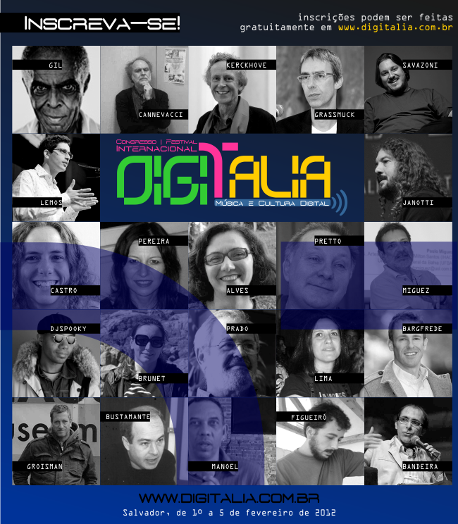 O “DIGITALIA – Festival/Congresso Internacional de Música e Cultura Digital” irá reunir, em Salvador, de 1o a 5 de fevereiro de 2012, diversas iniciativas que relacionam o campo da música às novas tecnologias da informação e da comunicação, notadamente aquelas conformadas pela chamada Cultura Digital.