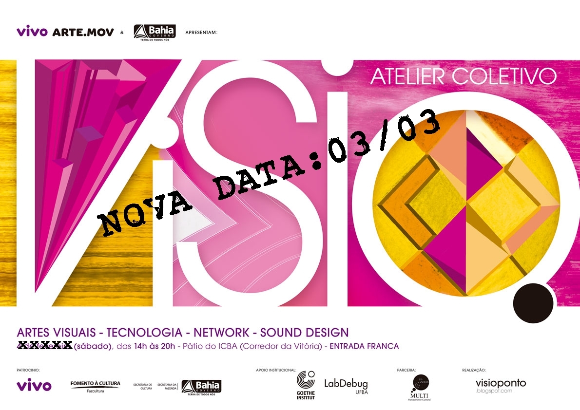 Oficina de Web-documentário, sound design, arte, tecnologia e resultados de ações colaborativas em rede. Estes são alguns dos itens que irão compor a programação da Atelier Coletivo VISIO. que acontece no sábado, dia 3 de março, a partir das 14h no Pátio do ICBA (Corredor da Vitória). Colaboração e trocas de experiências são palavras-chave do projeto mensal, que até abril de 2012, funciona como um laboratório das artes visuais, incluindo linguagens como fotografia, design gráfico, videoarte, web art, live act, performance, entre outras.