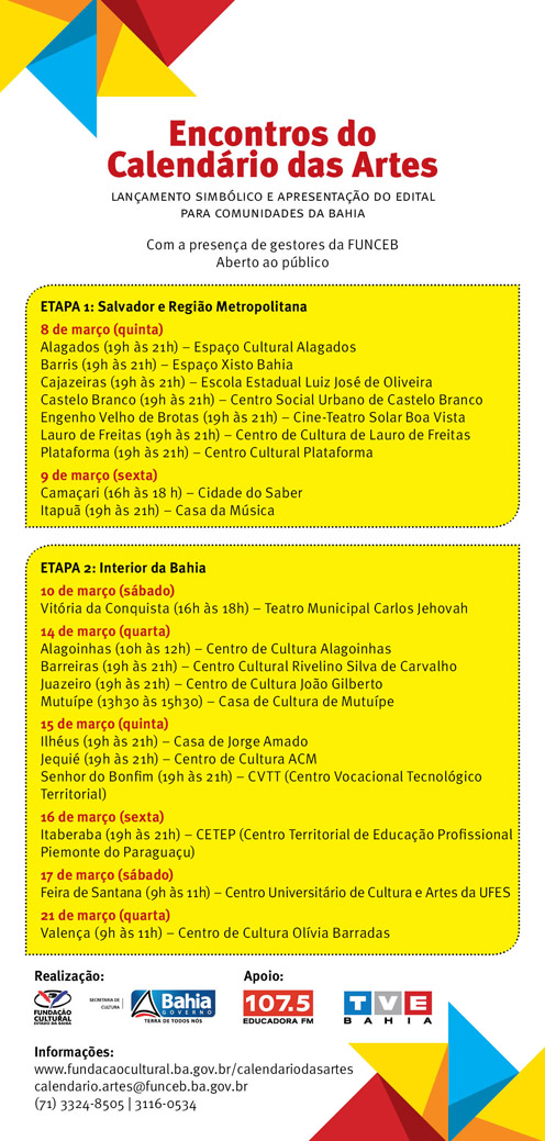 Com o objetivo de fortalecer a divulgação do Calendário das Artes perante artistas, produtores e demais possíveis interessados, a Fundação Cultural do Estado da Bahia (FUNCEB), unidade da Secretaria de Cultura do Estado (SecultBA), vai ao encontro da população em uma série de eventos de lançamento simbólico e apresentação do edital. Durante o mês de março, em Salvador e outras 13 cidades da Bahia, gestores da FUNCEB vão conduzir reuniões para mobilizar a participação de proponentes, bem como discutir as características do Calendário das Artes e dar orientações sobre a inscrição de propostas. A 1ª etapa dos encontros acontece em Salvador e Região Metropolitana, nos dias 8 e 9 de março (quinta e sexta-feira), nos bairros de Alagados, Barris, Cajazeiras, Castelo Branco, Engenho Velho de Brotas, Itapuã e Plataforma, além das cidades de Camaçari e Lauro de Freitas. A 2ª etapa dos encontros percorre outros onze municípios baianos – Alagoinhas, Barreiras, Feira de Santana, Ilhéus, Itaberaba, Jequié, Juazeiro, Mutuípe, Senhor do Bonfim, Valença e Vitória da Conquista – entre os dias 10 e 21 de março. Representantes da FUNCEB também vão comparecer a eventos artístico-culturais que estão sendo realizados no período, investindo na publicização do edital, a exemplo do que já foi feito no ciclo de debates do Diálogos Culturais, que ocorreu em Cachoeira nos dias 27 e 28 de fevereiro, e de visita à 5ª edição do Cine Capão, que acontece entre os dias 5 e 10 de março no Vale do Capão, em Palmeiras. Esta ação de encontros e circulação dá continuidade à prática do diálogo adotada pela FUNCEB, através de diversos encontros setoriais e do projeto FUNCEB ITINERANTE, realizado pela primeira vez em 2011, em que os dirigentes da Fundação visitaram os seis Macroterritórios baianos, representados pelas cidades de Alagoinhas, Senhor do Bonfim, Itaberaba, Barreiras, Vitória da Conquista e Ilhéus. A inclusão destas mesmas cidades na lista de locais a serem agora mais uma vez visitados visa a garantir que a população verifique o retorno dado às suas demandas, que apontaram maciçamente para as questões de facilitação e territorialização do acesso aos recursos públicos, fazendo o interior do estado ser representado nos mecanismos de apoio e em suas comissões de seleção, além de priorização do estímulo a pequenos projetos – pleitos ainda confirmados através das propostas resultantes das 26 Conferências Territoriais e da IV Conferência Estadual de Cultura, realizadas pela SecultBA no segundo semestre do ano passado. O Calendário das Artes, que se configura na intenção de contemplar estas questões, abrange as áreas de Artes Visuais, Audiovisual, Circo, Dança, Literatura, Música, Teatro e Artes Integradas, sendo um mecanismo de incentivo a projetos artísticos e culturais de pequeno porte na Bahia, que objetiva estimular o desenvolvimento das artes no estado. Concede prêmios de até R$ 13 mil e prioriza propostas oriundas e/ou realizadas em benefício de populações com menor acesso a produtos culturais e que privilegiem a diversidade cultural. As inscrições para a 1ª Chamada da edição 2012 do Calendário das Artes estão abertas até 2 de abril, recebendo propostas de ações para serem iniciadas entre os dias 1º de junho e 31 de agosto deste ano. Serão no mínimo 42 contemplados, somando um investimento total de R$ 546 mil, com previsão de que sejam pelo menos sete propostas premiadas de cada um dos seis Macroterritórios da Bahia. Para tanto, a avaliação dos projetos será feita de forma territorializada, com concorrência e comissões de seleção específicas em cada Macroterritório. O edital do Calendário das Artes, bem como seus anexos, orientações e mais informações, está disponível no site do Calendário das Artes. Calendário das Artes também é pauta de Videoconferências: saiba mais em clicando aqui.