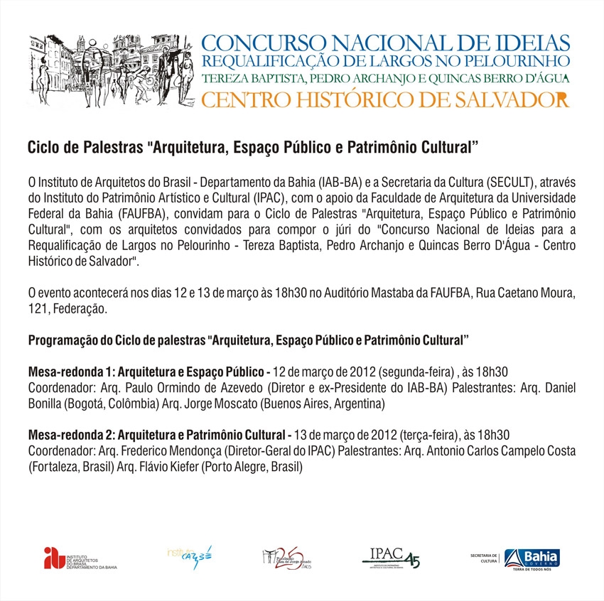 Nesta segunda (12) e terça-feira (13), a partir das 18h30, acontece na Faculdade de Arquitetura (FAU) da Universidade Federal da Bahia (UFBA) o ciclo de palestras – com participação gratuita – sob o tema ‘Arquitetura, Espaço Público e Patrimônio Cultural’, no auditório da faculdade, localizada na Rua Caetano Moura, nº121, bairro da Federação, em Salvador. Voltada para estudantes, professores, pesquisadores, arquitetos, museólogos, sociólogos, historiadores e outros especialistas da área artístico-cultural, as palestras integram iniciativa do Instituto do Patrimônio Artístico e Cultural da Bahia (IPAC), autarquia da Secretaria de Cultura (SECULT), em parceria com o Instituto dos Arquitetos do Brasil – seção Bahia (IAB) a apoio da FAU/UFBA. “Parte dos palestrantes integrarão a comissão que julgará os 36 projetos apresentados no Concurso Nacional de Idéias para a Requalificação de Largos no Pelourinho, cuja premiação acontecerá em 29 de março, em comemoração à passagem dos 453 anos de fundação de Salvador”, explica o diretor geral do IPAC, Frederico Mendonça. O concurso convocou arquitetos de todo o Brasil para criar projetos que beneficiarão os largos Tereza Batista, Pedro Archanjo e Quincas Berro D’Água na área do Pelourinho, Centro Histórico de Salvador. Os palestrantes são profissionais reconhecidos nos seus países e até internacionalmente, como Daniel Bonilla, Jorge Moscato, Antonio Carlos Campelo Costa e Flávio Kiefer. Colombiano graduado pela Universidad de Los Andes de Bogotá (1981-86), com Master in Urban Design pela Oxford Brookes University, Daniel Bonila, realizou estudos no College of Technology em Dublin, Irlanda e no Politécnico de Milão, Itália. Trabalhou ainda na Alcaldía de Bogotá em projetos de espaços públicos. Já Jorge Moscato nasceu na Argentina é titular do Estúdio Moscato - Schere em Buenos Aires, Argentina, desde 1969, juntamente com Rolando Schere. Professor titular de Arquitetura I a V na Faculdad de Arquitectura, Diseño y Urbanismo de la Universidade de Buenos Aires, é professor convidado em diversas universidades latino-americanas. Antonio Carlos Campelo Costa é cearense, dirigiu diversas instituições municipais e federais, incluindo a secretaria de Planejamento e Desenvolvimento Urbano e Meio Ambiente de Sobral (CE), entre outras, e presidiu o IAB Nacional. Dentre suas obras, destacam-se projetos de restauro, adaptação e requalificação urbana para sítios históricos tombados no âmbito federal, em diversas cidades. Arquiteto gaúcho, Flávio Kiefer concluiu mestrado sobre Arquitetura de Museus, no PROPAR/UFRGS, em 1998. Organizou livros para a conceituada Fundação Iberê Camargo - Álvaro Siza (2008), Guia de Arquitetura Contemporânea de Porto Alegre (2007) com Cláudia Costa Cabral e Crítica na Arquitetura (2001) com Raquel Rodrigues Lima e Viviane Maglia.