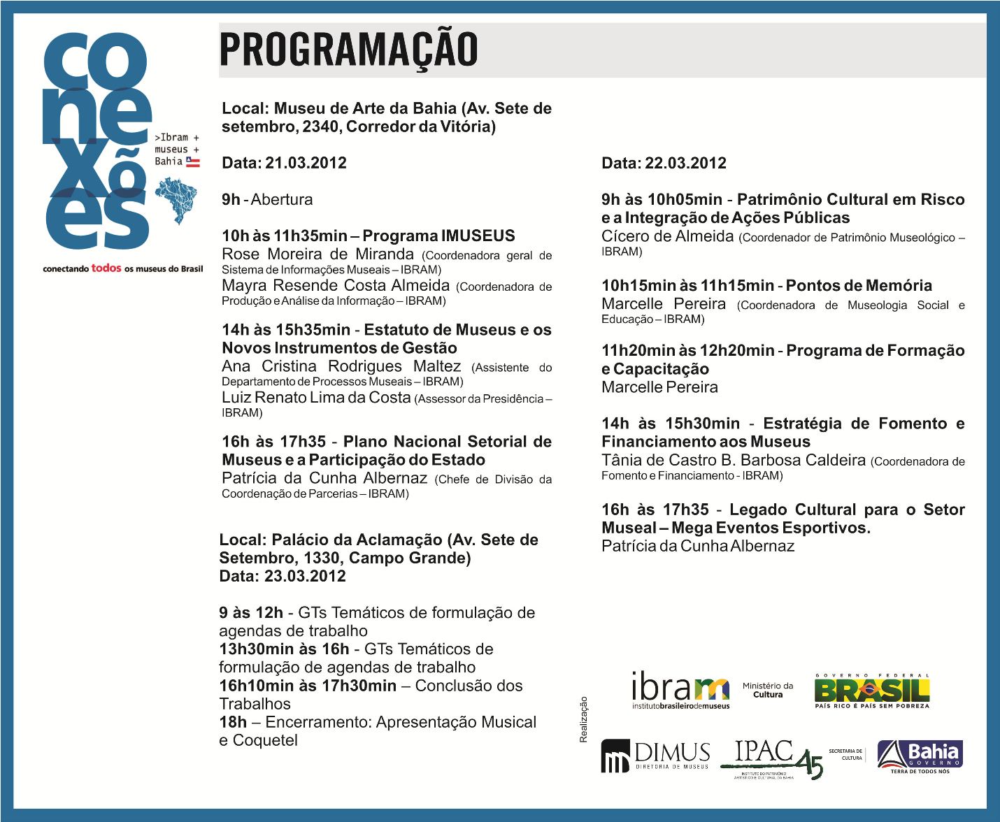 A ação acontece no Museu de Arte da Bahia (21 e 22.03) e no Palácio da Aclamação (23.03) e tem como objetivo construir uma agenda comum de trabalho e conectar as políticas do Ibram com as necessidades dos museus baianos. O evento contará com a presença do presidente do instituto, José do Nascimento Junior, e do secretário de Cultura do Estado, Albino Rubim, que assinarão um termo de cooperação para o desenvolvimento de ações conjuntas que contribuam para o fortalecimento, difusão, fomento e o incentivo do setor museológico na Bahia, a exemplo do lançamento de editais.