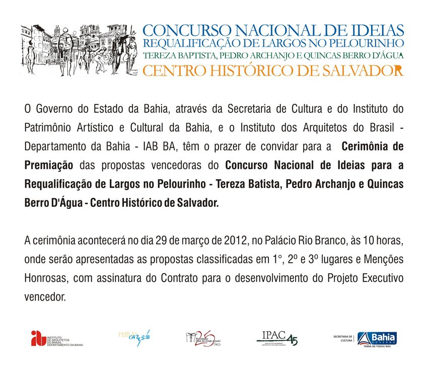 Salvador ganhará de presente no aniversário deste ano o projeto de requalificação dos três principais largos do Centro Histórico. Quincas Berro D’Água, Pedro Arcanjo e Tereza Batista, localizados no sítio chancelado pela UNESCO como Patrimônio Cultural da Humanidade. Batizados com nome de personagens de Jorge Amado – que estaria completando 100 anos de vida – os antigos quintais dos casarões coloniais transformados em largos na década de 90 serão requalificados pelo paulista Arthur de Mattos Casas, vencedor do Concurso Nacional de Ideias para Requalificação de Largos do Pelourinho. A iniciativa é do Governo do Estado da Bahia, através da Secretaria de Cultura (Secult) e Instituto do Patrimônio Artístico e Cultural da Bahia (Ipac), em parceria com o Instituto dos Arquitetos do Brasil – seção Bahia (IAB-BA). A cerimônia de premiação acontecerá no Palácio Rio Branco, a partir das 10h, no dia do aniversário da cidade, 29 de março, e contará com a presença do secretário Estadual da Cultura, Albino Rubim, do presidente do IAB-BA, Nivaldo Andrade; do diretor geral do Ipac, Frederico Mendonça, de representantes das equipes premiadas, além de personalidades do Centro Histórico. Na ocasião, o público terá a oportunidade de conhecer as cinco propostas classificadas, incluindo a grande vencedora apresentada pelo arquiteto paulista Arthur de Mattos Casas. “Este é um grande presente para a cidade. Os largos são um espaço de convivência que permite a interação social”, destaca o presidente do IAB-BA Nivaldo Andrade. >> Mais informações: Concurso Largos Pelourinho