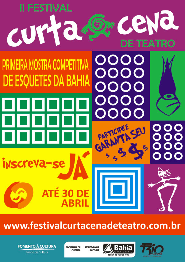 O prazo de inscrições para o II Festival CurtaCena de Teatro está chegando ao fim. Quem quiser participar da segunda edição da mostra competitiva de esquetes (peças curtas), deverá se inscrever até o dia 30 de abril, baixando pelo site www.festivalcurtacenadeteatro.com.br a ficha de inscrição, anexando em três vias o texto, um breve curriculum dos envolvidos e a proposta da montagem. Os documentos deverão ser enviados via SEDEX ou carta registrada para Rua Padre Camilo Torrend, 96, ap. 601. Ed. Maria Luiza, Federação. Salvador / Bahia. CEP: 40210-650. A esquete é uma palavra derivada do termo inglês “sketch” e é utilizada para denominar peças de curta duração ou cenas dramáticas. Apesar de ser ainda uma novidade na cidade, festivais de esquetes são cada vez mais constantes, com grande sucesso de público e crítica no eixo Rio-São Paulo. A atriz carioca Mariana Moreno, idealizadora do projeto, afirma que o projeto tem como principal meta a viabilização da experimentação do fazer teatral e do “estar no palco” para atores profissionais, amadores e, principalmente, estudantes de teatro. “Investimos em democratização cênica e em agentes facilitadores como a opção por esquetes, por serem montagens rápidas e de baixo custo”.O ingresso seráum livro literário para cada dia do evento. Do total de trabalhos enviados 16 serão selecionados e as apresentações ocorrerão durante os dois dias de festival. Para isso, uma comissão julgadora formada por Fernanda Paquelet, Luciana Comin e Marcelo Prado pela escolha. Dos selecionados pela comissão sairão cinco grupos vencedores que levarão um prêmio de R$ 500,00 cada um. As categorias premiadas serão Melhor Esquete, Melhor Texto Original, Melhor Diretor, Melhor Atriz e Melhor Ator. As apresentações acontecerão no Teatro Gamboa Nova, de 01 a 3 de junho, sendo que o último dia acontecerão as premiações e apresentação musical. Para a 2ª edição, o projeto foi aprovado pelo edital de Demanda Espontânea 2011, promovido pela Secretaria de Cultura, através do Governo do Estado da Bahia.