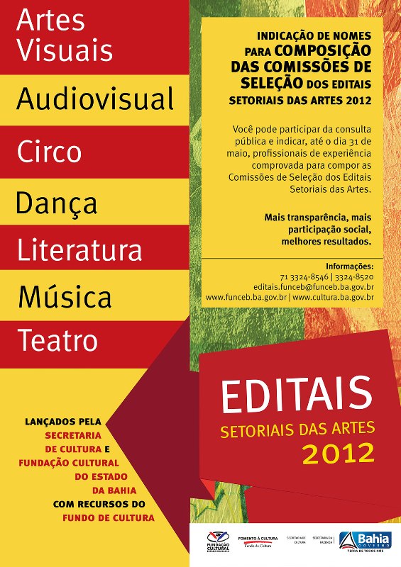 A Fundação Cultural do Estado da Bahia (FUNCEB), entidade vinculada à Secretaria de Cultura do Estado (SecultBA), e o Fundo de Cultura da Bahia (FCBA), vêm, desde 2007, investindo na democratização do acesso ao fomento à Cultura através de editais públicos. Neste ano, os Editais Setoriais de Artes Visuais, Audiovisual, Circo, Dança, Literatura, Música e Teatro, lançados em 15 de maio e com inscrições abertas até 15 de junho, apresentam mais uma ferramenta de participação social. Até o dia 31 de maio, cidadãos interessados podem contribuir para a formatação das Comissões de Seleção que vão avaliar as propostas inscritas nos concursos, questão fundamental para uma maior transparência deste processo. Para fazer indicações, basta acessar a página www.fundacaocultural.ba.gov.br/indicacao e preencher o formulário correspondente à linguagem artística desejada, recomendando nomes de profissionais de reconhecida atuação nas áreas específicas, que residam na Bahia e em outros estados. É importante que os indicados tenham experiência comprovada na área artístico-cultural para a qual forem sugeridos. Ressalta-se ainda que, em cumprimento ao disposto na Lei Estadual 9433/2005, os membros das Comissões de Seleção e seus parentes de até 2º grau não poderão participar ou propor projetos para estes editais. As indicações recebidas serão analisadas pela Diretoria Geral da FUNCEB, que designará os membros para participar das referidas Comissões.