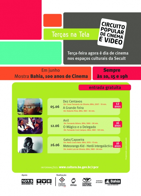 A Mostra Bahia, 100 Anos de Cinema continua no mês de junho com a exibição de filmes que homenageiam a memória baiana. Entre longas e curtas metragens - clássicos e contemporâneos, documentários e animações, o evento exibe um total de 27 filmes, distribuídos em 11 programas, presentes em 15 Espaços Culturais da capital, Região Metropolitana e interior (os Centros de Cultura Camilo de Jesus Lima e Amélio Amorim não entram no itinerário). Em junho as exibições acontecem nos dias 05, 12 e 26, sempre às terças-feiras, às 10h, 15h e 19h e com entrada gratuita. A Mostra se estende até o mês de julho. Quem abre a programação no dia 05 é o curta metragem 10 Centavos, de 2007, do diretor Cesar Fernandes de Oliveira. Logo em seguida um clássico baiano de Roberto Pires, A Grande Feira. O filme de ficção, produzido em 1961, apresenta a história de uma empresa imobiliária que ameaça de despejo os feirantes de Água de Meninos, em Salvador, e estes então, se organizam para resistir. Na trama, um marinheiro se vê envolvido nessa luta e se divide entre o amor de Maria da Feira, irmã de um bandido, e de Ely, moça da alta sociedade. Já o curta Anil de Fernando Bélens e o curta-documentário Gato/Capoeira de Mario Cravo Neto, serão exibidos nos dias 12 e 26, respectivamente. Com classificação de 16 anos, os filmes abordam temáticas realistas, com críticas sociais, a exemplo de Anil, que mostra histórias de exploração e denuncismo. Ainda na onda crítica, o drama O Mágico e o Delegado, de Fernando Coni Campos, conta sobre a chegada de um mágico numa pequena e pobre cidade do interior da Bahia, e comovido com toda a miséria, resolve realizar um truque para trazer fartura à região. Fechando a programação do mês, no dia 26, um filme produzido em plena ditadura militar: Meteorango Kid – Herói Intergaláctico. Do diretor André Luiz de Oliveira, o longa metragem mostra através das aventuras do estudante universitário Lula, e de uma maneira anárquica e irreverente, uma geração oprimida pela ditadura militar e pela moral retrógrada de uma sociedade passiva e hipócrita. Com todo esse contexto, e através das parcerias que os centros têm estabelecidos com as escolas municipais, a mostra mais uma vez firma uma relação entre o lazer e a cultura, o conhecimento. Apresenta uma nova didática e incentiva os jovens ao consumo inteligente da sétima arte.