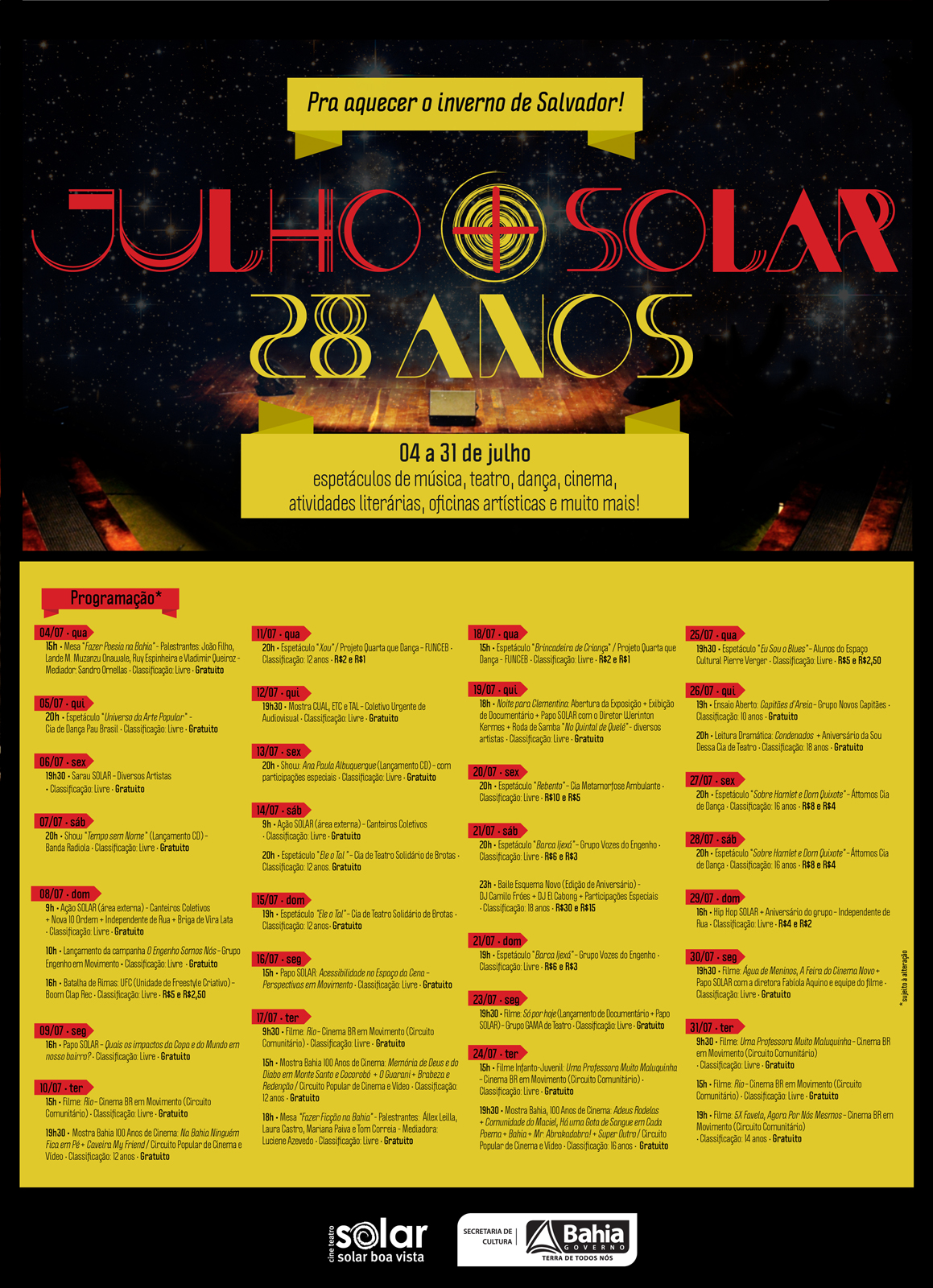 Entre os dias 04 e 31 de Julho, o Cine Teatro Solar Boa Vista (Engenho Velho de Brotas) comemora seu 28º aniversário com a programação Julho + SOLAR. Nesses 28 dias de festejo, acontecem diversas apresentações de música, teatro, dança exibições de filmes, atividades literárias, oficinas artísticas, dentre outras ações que além de movimentar o espaço, contribuem para a plena revitalização do Parque Solar Boa Vista, onde está situado. Para assegurar ao público uma maior possibilidade de acesso, as atividades têm ingressos gratuitos ou a preços populares. Chicco Assis, coordenador do espaço cultural, explica: “Optamos por comemorar 28 anos em 28 dias devido à grande demanda de propostas que recebemos, são muitos artistas interessados em participar das comemorações de mais um aniversário do SOLAR”. Para ele, “a programação de aniversário é um grande mosaico, que contempla uma ampla diversidade de linguagens artísticas e de formatos de atividades. Um presente para o público que terá acesso a um panorama bem abrangente de possibilidades culturais”. Em homenagem aos 141 anos do falecimento do poeta Castro Alves – que residiu na região que o espaço se localiza – serão realizadas duas mesas literárias. A primeira abre a programação no dia 04, sob o tema Fazer Poesia na Bahia, e outra acontece no dia 17 com o tema Fazer Ficção na Bahia. Todas elas serão às 15h e com entrada gratuita. Já no dia 06, aniversário do Cine Teatro, acontece às 19h30 o Sarau SOLAR, evento que visa estabelecer um espaço de encontro e interação entre os artistas e grupos participantes da programação. Outra personalidade homenageada na programação é a cantora Clementina de Jesus. No dia 19, em que completa 25 anos de seu falecimento, é realizada a abertura de exposição com imagens da cantora. Estarão presentes Werinton Kermes, diretor do documentário Clementina de Jesus: Rainha Quelé, e nomes como Juliana Ribeiro, Márcia Short, Dão, entre outros, que encerram o evento com uma roda de samba. Os grupos artísticos abrigados pelo Solar e outros parceiros do espaço cultural também participam intensamente das comemorações. As Companhias Pau Brasil, de dança, Metamorfose, de teatro, o grupo performático Vozes do Engenho e alunos do Espaço Cultural Pierre Verger trazem espetáculos de dança, teatro e música durante toda programação. Ações sociais também entram na programação do evento. Juntamente à campanha O Engenho Somos Nós, intervenções urbanas serão realizadas, numa tentativa de mobilização para transformação da realidade do Engelho Velho de Brotas. Outro projeto que o Solar volta a receber é o Quarta Que Dança, da coordenação de Dança da FUNCEB. Nos dias 11 e 18 espetáculos serão realizados a preços populares, ingressos à R$ 2 e 1(meia). Além da comemoração dos 28 anos do Solar, outros aniversários também serão celebrados ao longo da programação. No dia 21 o Baile Esquema Novo comemora cinco anos, com a participação dos DJs Camilo Fróes e El Cabong. Já a Áttomos Cia de Dança e grupo Independente de Rua comemorarão seus 10 anos com apresentações nos dias 27, 28 e 29. Cinema e Audiovisual também entram na agenda O audiovisual ganha um destaque especial na programação do Julho + SOLAR. Irão acontecer mostras e exibições de diversos filmes brasileiros, como a continuação do projeto Terças na Tela com a Mostra Bahia, 100 anos de Cinema. Também as terças, acontecem exibições dos filmes Rio e Uma Professora Muito Maluquinha, exibidos às 9h30 ou às 15h, nos dias 10, 17 e 24. E no dia 31, às 19h30, ocorre uma sessão única do filme 5X Favela – Agora por Nós Mesmos, encerrando a programação. As sessões são gratuitas e voltadas para escolas e instituições sociais e culturais. O Coletivo Urgente de Audiovisual realiza mais uma Mostra CUAL, ETC e TAL, no dia 12, às 19h30, com o já tradicional bate-papo sobre a produção audiovisual contemporânea, após a sessão. E por fim, no dia 30, às 19h30, acontece uma sessão especial do recém-lançado documentário Água de Meninos, uma Feira do Cinema Novo. A diretora Fabíola Aquino estará presente e também participará, juntamente com outros integrantes do filme, de um bate-papo depois da exibição. Confira abaixo a programação completa (clique na imagem para ampliá-la):