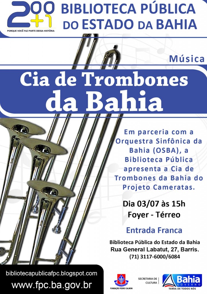 A Biblioteca recebe, na próxima terça-feira (03), a música da camerata Cia de Trombones da Bahia. A apresentação é resultado da parceria com a Orquestra Sinfônica da Bahia (OSBA) e acontece no Foyer (térreo), a partir das 15h, com entrada gratuita.