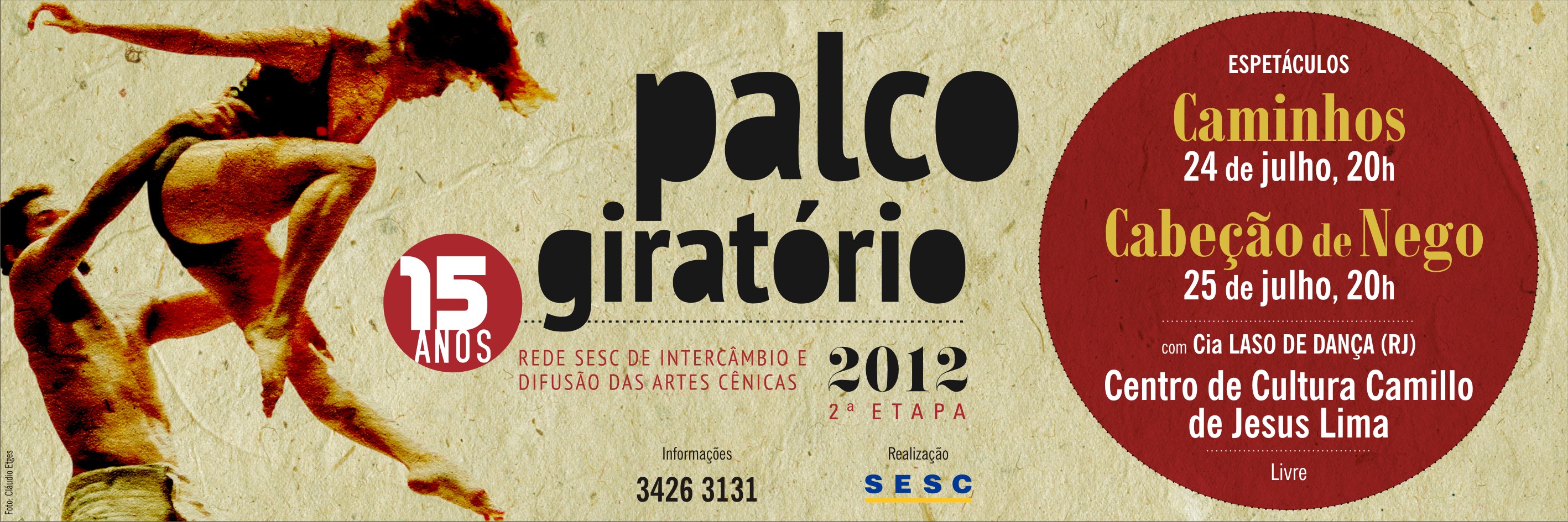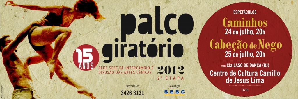 Sobre o Palco Giratório - Criado pelo SESC em 1998, o Palco Giratório é o único circuito de artes cênicas de grande porte que percorre todos os estados do país. Já passaram por ele mais de 170 grupos teatrais, que realizaram aproximadamente 5 mil apresentações, alcançando 2,5 milhões de espectadores. Em 2012 o Palco realiza a sua 15ª edição e circulará por 122 cidades, com 23 espetáculos. Ao todo, serão 700 apresentações dos mais diversos gêneros, como drama, musical, teatro gestual, infantil, épico, de animação, de máscaras, dança de rua e contemporânea.