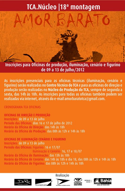O TCA.Núcleo abre, nesta segunda-feira, dia 09 de julho, inscrições para as oficinas que visam à qualificação e seleção dos assistentes de direção, produção, iluminação, cenário e figurino da montagem do Núcleo em 2012, “Amor Barato”, que tem estreia agendada para novembro, na Sala do Coro do Teatro Castro Alves. Para realizar as inscrições em qualquer uma das oficinas do TCA.NÚCLEO 2012 são necessárias fotocópias de RG e currículo artístico. As inscrições para as oficinas ficam abertas até o dia 13 de julho. As inscrições presenciais para as oficinas técnicas (iluminação, cenário e figurino) serão realizadas no Centro Técnico do TCA e para as oficinas de direção e produção serão realizadas no Núcleo de Produção do TCA, sempre de segunda a sexta, das 14h às 18h. As inscrições para todas as oficinas também podem ser realizadas via internet, através do e-mail amorbaratotca@gmail.com. Mais informações e o texto original da montagem estão disponíveis nos sites www.tca.ba.gov.br e www.amorbaratotca.wix.com/omusical. O preenchimento de vagas será realizado através de seleção de currículos e os resultados estarão disponíveis nos sites da montagem e do TCA a partir das 18h do dia 13. Amor Barato – Selecionado via edital público, o espetáculo musical “Amor Barato” tem direção de Fábio Espírito Santo, direção musical de Jarbas Bittencourt e Ronei Jorge e preparação vocal do maestro Angelo Rafael Fonseca. Integram também a equipe artística do espetáculo, a co-diretora Vadinha Moura, a coreógrafa Ana Paula Bouzas, o figurinista Rino Carvalho, o cenógrafo Rodrigo Frota e o produtor executivo Elísio Lopes Jr. O musical inédito aborda, com ironia e humor sarcástico, temas presentes na sociedade contemporânea como as disputas nas esferas do poder, corrupção, manipulação midiática e degradação da estrutura familiar, tendo como pano de fundo o amor impossível entre um rato e uma barata, vivido no submundo dos esgotos de uma metrópole brasileira. O texto, vencedor do edital de Apoio ao Desenvolvimento de Textos Dramatúrgicos do Estado da Bahia/2010, resultou numa versão moderna, para adultos, da fábula infantil “O casamento de Dona Baratinha”. A montagem é uma realização do Teatro Castro Alves e da DA RIN Produções Culturais.