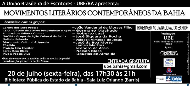 A União Brasileira de Escritores – UBE/BA celebra o Dia Nacional do Escritor (25/07) com o seminário: Movimentos Literários Contemporâneos da Bahia, com a participação de vários grupos que mantém a literatura baiana em constante renovação. O evento será realizado no dia 20 de julho (sexta-feira), a partir das 17h30, na Sala Luiz Orlando da Biblioteca Pública do Estado da Bahia (Barris). O evento será coordenado pelo jornalista Carlos Souza - coordenador da UBE/BA. Entre os convidados estão: Círculo de Estudo Pensamento e Ação – CEPA (Germano Machado); Movimento Cultural Artpoesia (José da Boa Morte); Grupo de Ação Cultural da Bahia – GACBA (José Siquara da Rocha); Projeto Fala Escritor (Leandro de Assis); Viva a Poesia Viva (Douglas de Almeida); Caruru dos Sete Poetas (João Vanderlei de Moraes Filho); Sarau Bem Black (Nelson Maca); Galinha Pulando / Prêmio Literário (Valdeck Almeida de Jesus); Fundação e Editora Òmnira (Roberto Leal) e Pós-Lida (James Martins). O evento será dividido em três blocos, na qual os coordenadores dos movimentos participantes falarão sobre a história e projetos realizados. Durante o evento, também será realizado uma minifeira de livros com obras publicadas pelos grupos presentes e recital de poesia. Dia Nacional do Escritor - O dia 25 de julho é um dia dedicado a homenagear o escritor brasileiro. O surgimento da data se deu a partir da década de 60, através de João Peregrino Júnior e Jorge Amado, quando realizaram o I Festival do Escritor Brasileiro, organizado pela União Brasileira de Escritores - UBE, do Rio de Janeiro a que os dois eram presidente e vice-presidente, respectivamente.