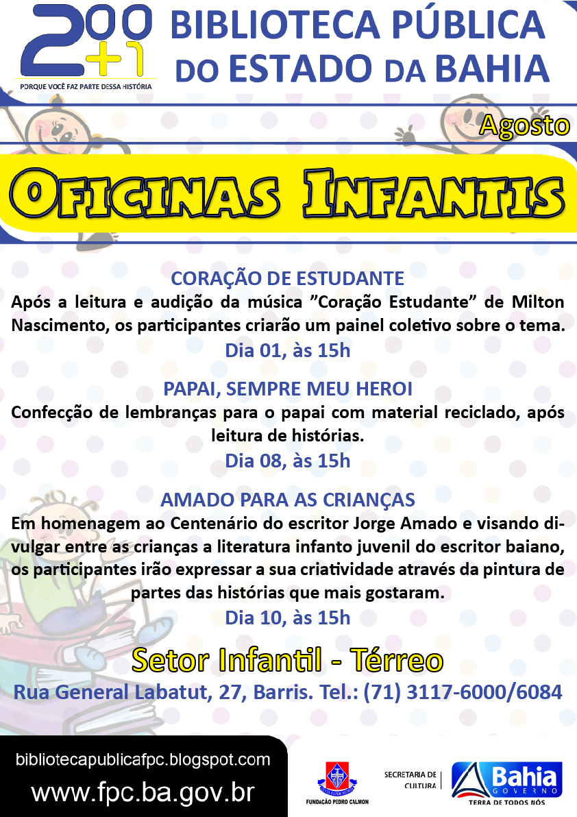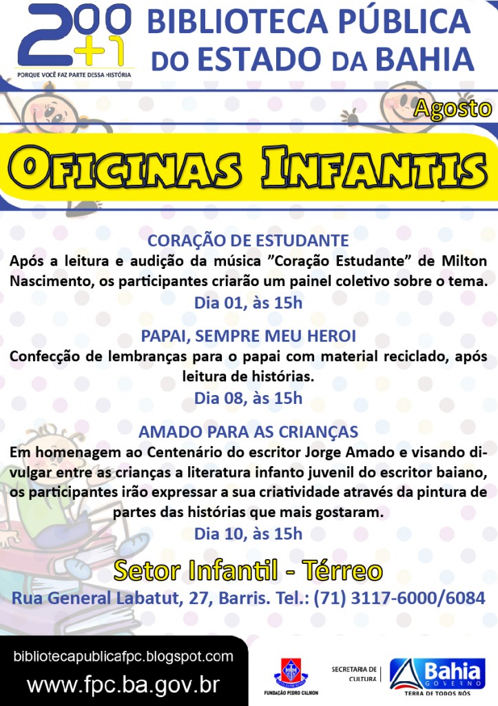Lugar de criança também é na Biblioteca. Com muitos livros, brincadeiras e oficinas, o Setor Infantil da Biblioteca Pública do Estado da Bahia (térreo) convida a turma para uma viagem divertida pelo universo mágico da leitura. Durante a primeira quinzena do mês de agosto, serão oferecidas três oficinas temáticas, que celebram o Dia do Estudante, o Dia dos Pais e o centenário do escritor Jorge Amado. As oficinas acontecem nos dias 01, 08 e 10/08, sempre às 15h, com entrada gratuita.