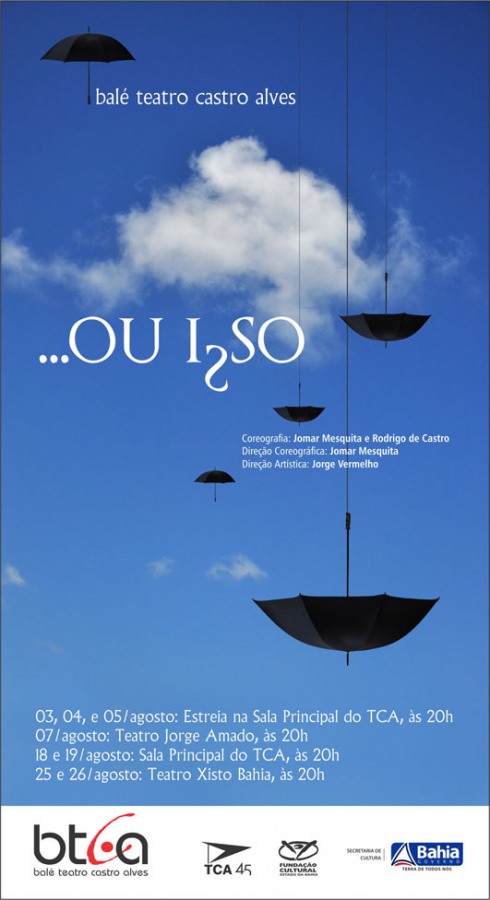 A nova montagem do Balé do Teatro Castro Alves – BTCA, intitulada “…Ou Isso”, fará parte da programação de dois Espaços Culturais da Secretaria de Cultura do Estado da Bahia. O Espaço Xisto Bahia e o Cine Teatro Solar Boa Vista recebem o espetáculo nos dias 25 e 26 de agosto e 22 de setembro, respectivamente. As apresentações serão sempre às 20h e com entrada gratuita. Com direção artística de Jorge Vermelho, a coreografia ficou por conta dos premiados Jomar Mesquita (que também assume a direção coreográfica) e Rodrigo de Castro. A coreografia foi livremente inspirada na obra do poeta Manoel de Barros, um homem que ousou na forma de enxergar a realidade, buscando sempre por diferentes perspectivas. Os bailarinos também foram desafiados a enxergar esta com olhos livres de modelos pré-concebidos. Eles entraram diretamente em contato com a obra, assistindo documentários e filmes, buscando ferramentas para se aperfeiçoarem. “Neste encontro, temos também a cumplicidade de artistas comprometidos com a arte, Ed Andrade dando inventividade à cenografia, Cláudia Schapira recosturando sentidos em um figurino que se reinventa, e Irma Vidal que busca na iluminação ampliar nossos sentidos sobre a luz e a sombra, e como uma é complemento da outra”, afirma Jorge Vermelho. A estréia de “…Ou Isso” aconteceu no dia 03 de agosto, na Sala Principal do Teatro Castro Alves, com apresentações também no dia 04 e 05. Passará pelo Teatro Cidade do Saber, em Camaçari, dia 01 de setembro, e pelo Teatro Jorge Amado dia 07 do mesmo mês.