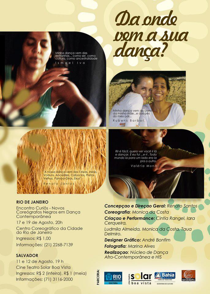 Nos dias 11 e 12 de agosto acontece no Cine Teatro Solar Boa Vista o espetáculo de dança “Da onde vem a sua DANÇA”! uma parceria entre a artista Iara Cerqueira, do grupo HIS Contemporâneo de Dança, e a artista Monica da Costa do Rio de Janeiro. No primeiro dia de apresentação o elenco realiza um bate papo aberto ao público sobre o processo, a colaboração, parceria e outros projetos desenvolvidos pelas artistas no Eixo Rio-Salvador. Espetáculo de dança afro-contemporânea com vídeo que parte da concretude dos sentidos na dança – visão, paladar, audição, tato e olfato. Apontando esses sentidos, a dança de Obaluye/Omolu e seus atributos foram matéria de pesquisa e criaçäo para o espetáculo: terra, peso, tudo o que é perecível e transmuta, passado e presente imediatos e longínquos, pequenas mortes. Compondo o território de pesquisa e coreografia, trabalhamos com os sentidos presentes em depoimentos de artistas como Rubens Barbot, Ismael Ivo, Carmen Luz, Elísio Pitta, Valéria Monä, Ignez Calfa, Kátia Gualter e Julio Rocha à pergunta mote do espetáculo. De Onde Vem a Sua Dança? Vem da concretude do corpo e do sentir, da ancestralidade e das antropofagias, da ocupação e criaçäo de territórios.