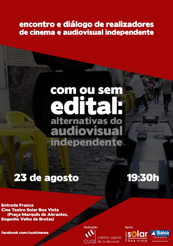Cinema se faz com dinheiro ou com vontade? Para debater essas e outras questões, o CUAL – Coletivo Urgente de Audiovisual organiza o encontro de realizadores de cinema e audiovisual Com ou sem edital: alternativas do audiovisual independente. O evento é gratuito e acontece na quinta-feira (23/08), às 19h30, no Solar Boa Vista (Brotas), que é parceiro do projeto. O encontro tem o apoio da Secretaria de Cultura do Estado da Bahia. Dentre os convidados que já confirmados, estão diversos nomes do meio cinematográfico baiano. Gente como os diretores Daniel Lisboa, Carlos Pronzato e Edson Bastos, dentre outros realizadores que já produziram com e sem recurso público. A proposta do evento é criar um espaço para o debate colaborativo onde surjam ideias e alternativas diversas para a produção do audiovisual contemporâneo. A partir de múltiplas experiências e pontos de vista, a discussão pretende facilitar a formação de uma rede de pessoas interessadas na área, promovendo ações e novos projetos que busquem outras plataformas de produção. Questionar os editais públicos como único caminho para o desenvolvimento do cinema e o audiovisual baiano, propondo novos olhares, filmes, clips e vídeos nos inúmeros formatos de captação e exibição. Construindo propostas, parcerias e aproximando realizadores, produtores, atores, e pessoas interessadas de outras áreas artísticas, o evento quer também estabelecer demandas que potencializem a discussão para o plano prático. O encontro faz parte de uma série de ações promovidas pelo Cual que englobam a produção e a exibição dessa vertente do audiovisual. Dentre as novidades, no que diz respeito às ações do coletivo, estão a participação de dois filmes (Fake-me, dir. Marcus Curvelo, e O Caminho Mais Próximo de Casa, dir. Ramon Coutinho e Francisco Gabriel) na 8ª Mostra Cinema Conquista. A participação dos curtas Não Estou Aqui e Fake-me (ambos dirigidos por Marcus Curvelo) em diversos festivais nacionais. E o projeto Oficinas Urgentes Audiovisuais, selecionado pela Funceb, no Calendário das Artes desse ano, voltado para o ensino do audiovisual. SOBRE O CUAL Composto por um grupo de amigos (publicitários, jornalistas, historiadores, atores, alguns formados na primeira turma do Bacharelado Interdisciplinar em Artes com Concentração na Área de Cinema da UFBA), a ideia do grupo é praticar “um cinema que prioriza o processo e o encontro, a criticidade e a (re)invenção”, como explica Ramon Coutinho, um dos membros do coletivo. Passado pouco mais de um ano desde a criação do grupo, a fórmula deu bons frutos. "Além de diversos vídeos e experimentos, realizamos em torno de nove curtas nos mais diversos níveis de recurso e estrutura, alguns premiados. Já são doze curtas produzidos. “E há incontáveis roteiros pra filmar nesse segundo ano de atividades... ", comenta Coutinho. Além da produção dos vídeos, o Cual frequentemente promove mostras, com trabalhos próprios e de convidados. O coletivo - formado por Ramon Coutinho, Álvaro Andrade, Marcus Curvelo, Bianca Muniz, Danilo Umbelino, Deise Valente, Bruno Guimarães, Francisco Gabriel Almeida e Luan Santana Marques - agrega ainda parceiros das mais diversas áreas, como os músicos Vítor e Paulo Rios, do Conjunto de Câmara da Escola de Música (Emus) da Universidade Federal da Bahia (Ufba), Camará, que já fizeram trilhas para os curtas do grupo. .