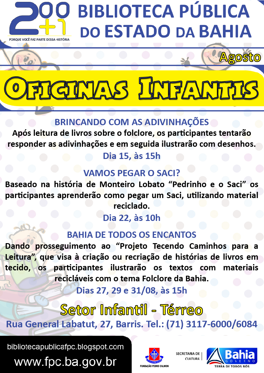 Lugar de criança também é na Biblioteca. Com muitos livros, brincadeiras e oficinas, o Setor Infantil da Biblioteca Pública dos Barris (térreo) convida a turma para uma viagem divertida pelo universo mágico da leitura. Durante a segunda quinzena do mês de agosto, serão oferecidas três oficinas temáticas, que celebram o Dia do Folclore. As oficinas acontecem nos dias 15, 22, 27, 29 e 31/08, com entrada gratuita. Confira a programação: Literária BRINCANDO COM AS ADIVINHAÇÕES Após leitura de livros sobre o folclore, os participantes tentarão responder as adivinhações e em seguida ilustrarão com desenhos. – Setor Infantil - Térreo Dia 15, às 15h Literária VAMOS PEGAR O SACI? Baseado na história de Monteiro Lobato “Pedrinho e o Saci” os participantes aprenderão como pegar um Saci, utilizando material reciclado. – Setor Infantil - Térreo Dia 22, às 10h Artística BUMBA-MEU-BOI A partir da leitura de livros, revistas e vídeos sobre o tema, os participantes confeccionarão um boi utilizando materiais recicláveis. Logo após, será feita uma encenação da Festa do Bumba-meu-boi. A atividade será aberta ao público, com idade mínima de 10 anos, e limite de 15 (quinze) vagas. - Setor Infantil – Térreo Dia 22, das 14h às 17h Literária BAHIA DE TODOS OS ENCANTOS Dando prosseguimento ao “Projeto Tecendo Caminhos para a Leitura”, que visa à criação ou recriação de histórias de livros em tecido, os participantes ilustrarão os textos com materiais recicláveis com o tema Folclore da Bahia. – Setor Infantil - Térreo Dias 27, 29 e 31/08, às 15h