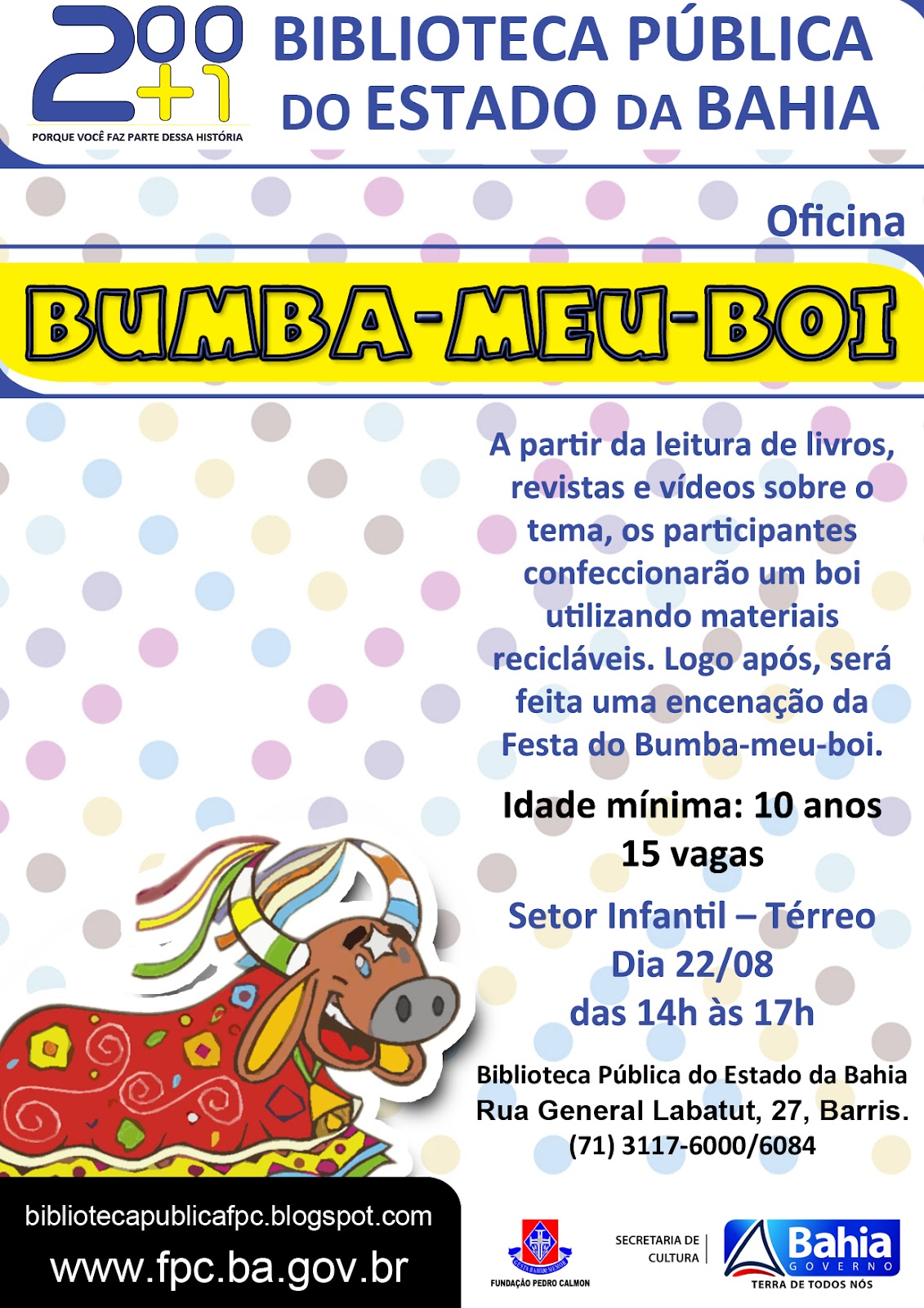 Em homenagem ao Dia do Folclore, o Setor Infantil da Biblioteca promove a oficina “Bumba-meu-boi”, que oferece 15 vagas para crianças maiores de 10 anos. A oficina acontece na próxima quarta-feira (22), das 14h às 17h, e tem entrada gratuita.
