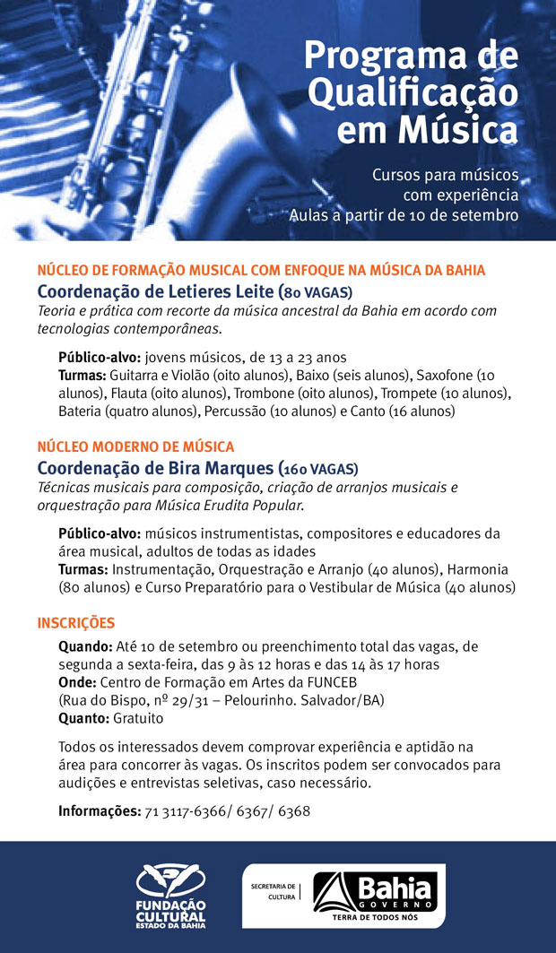 O Centro de Formação em Artes (CFA) e a Coordenação de Música da Fundação Cultural do Estado da Bahia (FUNCEB), unidade da Secretaria de Cultura do Estado (SecultBA), convocam artistas da música para o Programa de Qualificação em Música, que vai oferecer cursos diversos para o aperfeiçoamento do trabalho de quem já tem experiência na área. No total, 240 vagas são disponibilizadas para turmas estruturadas em dois Núcleos: Formação Musical com Enfoque na Música da Bahia, coordenado por Letieres Leite, e Núcleo Moderno de Música, coordenado por Bira Marques. As aulas serão iniciadas em 10 de setembro, na sede do CFA (Pelourinho), e as inscrições, que são gratuitas, ficam abertas até a mesma data ou até o preenchimento total das vagas, podendo ser feitas no mesmo local. Na perspectiva de uma educação cidadã, os princípios do Centro de Formação em Artes, além de prezar pela formação técnica e iniciação artística, também se alinham à política de educação profissional dos Ministérios da Cultura e da Educação, tendo em vista a qualificação dos trabalhadores das artes. Esta iniciativa também responde a um diagnóstico obtido através de entrevistas e encontros, realizados entre dezembro de 2011 e fevereiro de 2012, com instituições públicas que oferecem curso de formação em Música e profissionais de educação musical atuantes na Bahia. Entre as representações ouvidas, estiveram a Escola de Música da Universidade Federal da Bahia (UFBA), o Colegiado de Licenciatura em Música da Universidade Estadual de Feira de Santana (UEFS), o Núcleo de Artes da Universidade Estadual da Bahia (UNEB), a Orquestra Sinfônica da Bahia (OSBA), o Curso Técnico de Música do Colégio Manoel Novaes, o Centro Estadual de Educação Profissional em Artes e Design e o Núcleo Moderno de Música. Esta escuta confirmou a necessidade de promover qualificação formal para que jovens músicos e profissionais da área possam enriquecer seus conhecimentos, aprimorar sua atuação profissional e obter melhores condições de inserção no mercado de trabalho e na sociedade. Um fator que consolida a importância desta demanda advém da Lei Federal 11.769, aprovada em 2011, que garante a obrigatoriedade do ensino de música nas escolas públicas, o que amplia as oportunidades formais de emprego e renda para professores capacitados no setor. O Programa de Qualificação em Música consolida um projeto piloto de formação continuada em música, executado pela FUNCEB no segundo semestre do ano passado. Nesta ação, o próprio maestro Letieres Leite, à frente do trabalho de dez outros professores, atendeu a 50 alunos oriundos de projetos sociais e ONGs de Salvador, para qualificá-los no seu fazer artístico enquanto músicos, numa metodologia que privilegiou a música afrobaiana e o seu universo percussivo, aliados à música contemporânea mundial. Estes alunos têm lugar garantido para dar prosseguimento aos seus processos formativos através dos novos cursos. Da mesma maneira, músicos que participaram de Encontros Setoriais promovidos pela FUNCEB no interior da Bahia serão especialmente convidados para as aulas, reservando 10% das vagas para eles, nos dois módulos. Cursos e vagas No Núcleo de Formação Musical com Enfoque na Música da Bahia, coordenado por Letieres Leite, o aprendizado é voltado para a prática e o pensamento em música, cujo conteúdo tem um forte recorte da música ancestral da Bahia em acordo com tecnologias contemporâneas. O propósito é de capacitar jovens músicos, de 13 a 23 anos, para que encaminhem suas carreiras de maneira qualificada no mercado de trabalho. Serão formadas turmas de Guitarra e Violão (oito alunos), Baixo (seis alunos), Saxofone (10 alunos), Flauta (oito alunos), Trombone (oito alunos), Trompete (10 alunos), Bateria (quatro alunos), Percussão (10 alunos) e Canto (16 alunos). Ao todo, serão, portanto, 80 músicos matriculados, que também terão aulas de Teoria Musical. No Núcleo Moderno de Música, coordenado por Bira Marques, técnicas musicais para composição, criação de arranjos musicais e orquestração para Música Erudita Popular são os módulos principais. Os cursos, constituídos em oito turmas de 20 alunos, totalizando 160 inscritos, são direcionados para músicos instrumentistas, compositores e educadores da área musical, adultos de todas as idades, que pretendem atuar profissionalmente no mercado da música baiana. Serão formadas turmas de Instrumentação, Orquestração e Arranjo (40 vagas), Harmonia (80 vagas) e Curso Preparatório para o Vestibular de Música (40 vagas). Todos os interessados nos dois módulos devem comprovar experiência e aptidão na área para concorrer às vagas. Os inscritos podem ser convocados para audições e entrevistas seletivas, caso necessário.