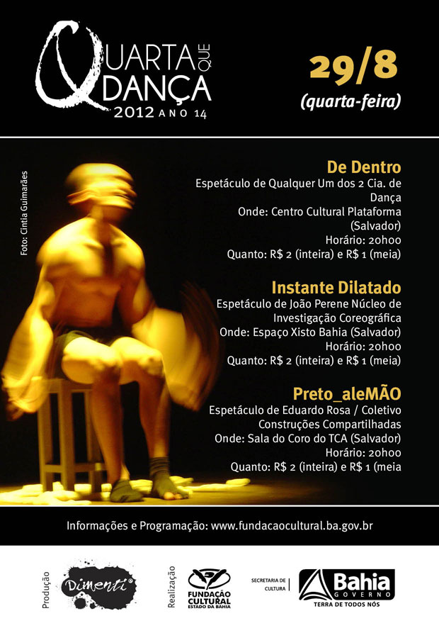 Na próxima quarta-feira, 29 de agosto, o público de Salvador vai ter três opções de espetáculos de dança para conferir. Eles integram a 14ª edição do Quarta que Dança, projeto da Fundação Cultural do Estado da Bahia (FUNCEB), unidade da Secretaria de Cultura do Estado (SecultBA), que chega à sua 11ª semana. As montagens serão encenadas às 20 horas, em diferentes locais da capital baiana, com ingressos ao preço popular de R$ 2 (inteira). Instante Dilatado, da companhia João Perene Núcleo de Investigação Coreográfica, terá sessão no Espaço Xisto Bahia.De Dentro, da Qualquer Um dos 2 Cia. de Dança, oriunda de Juazeiro, se apresenta no Centro Cultural Plataforma.Preto_aleMÃO, de Eduardo Rosa / Coletivo Construções Compartilhadas, vai para a Sala do Coro do TCA. Sobre o Quarta que Dança – Realizado pela Fundação Cultural do Estado da Bahia (FUNCEB), entidade vinculada à Secretaria de Cultura do Estado (SecultBA), o Quarta que Dança, desde 1998, vem se configurando como um importante projeto de difusão da produção atual de dança na Bahia, no propósito de dar visibilidade a este cenário. Nesta sua 14ª edição, cada uma das 15 propostas selecionadas através de edital público realiza três apresentações em locais diferentes, garantindo uma agenda continuada de dança durante todas as quartas-feiras entre 20 de junho e 12 de setembro. Em 2011, o projeto foi redimensionado para além de Salvador, chegando pela primeira aos palcos do interior, nas cidades de Juazeiro e Paulo Afonso, o que veio a fortalecer o fomento à produção de dança nos diversos territórios baianos. Neste ano, a presença em outros municípios é maior: Alagoinhas, Bom Jesus da Lapa, Itabuna, Itacaré, Poções, Santa Maria da Vitória, Senhor do Bonfim e Vitória da Conquista participam da programação. Espaços culturais públicos integram a rede de parceiros, através do apoio da Diretoria de Espaços Culturais (Sudecult/SecultBA). Na capital, contamos com o Centro Cultural Plataforma, Cine-Teatro Solar Boa Vista, Espaço Cultural Alagados, Espaço Xisto Bahia e Sala do Coro do Teatro Castro Alves. No interior, participam o Centro de Cultura Adonias Filho (Itabuna) e o Centro de Cultura de Alagoinhas. Há ainda os espaços privados que recebem as encenações em outras cidades. Em todos os locais, o valor de ingressos é de R$ 2 (inteira) e R$ 1 (meia) para assistir a espetáculos e trabalhos em processo de criação, cujo desenvolvimento é compartilhado com o público numa conversa sobre as pesquisas após as apresentações. O projeto ainda conta, desde 2007, com uma programação que avança pelo ambiente urbano. Ruas, praças, praias e uma estação de trem vêm sendo ocupadas por dança de rua e intervenções urbanas, fortalecendo a diversidade de formatos e ampliando o acesso do público a apresentações de dança, em performances gratuitas.