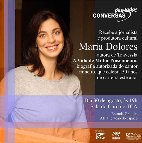 A próxima edição do Projeto Conversas Plugadas recebe a jornalista e produtora cultural Maria Dolores, autora de "Travessia - a vida de Milton Nascimento”, biografia autorizada do cantor mineiro, que celebra 50 anos de carreira este ano. O bate-papo acontece dia 30 de agosto, às 19 horas, na Sala do Coro do TCA, com entrada gratuita. Maria Dolores é a produtora nacional da turnê de Milton Nascimento, que chega à Sala Principal do Teatro Castro Alves dia 1º/09, já com ingressos esgotados. Maria Dolores é jornalista formada pela Universidade Federal de Minas Gerais e autora do livro "Travessia - a vida de Milton Nascimento"- ed. Record. É também sócia fundadora da empresa que produziu a Turnê “Milton Nascimento – E a gente sonhando” em 2011 e produz “Milton Nascimento- 50 anos de carreira”, em 2012. No Conversas Plugadas Maria Dolores vai abordar o processo de produção cultural desde a concepção do projeto até a captação de recursos e produção, tendo como fio condutor o projeto "Milton Nascimento - 50 anos de carreira" e passando por momentos marcantes da carreira e da vida de Milton Nascimento, retratados no livro "Travessia", que deu origem às diversas parcerias entre Maria Dolores e Milton Nascimento e à própria entrada da escritora no mercado de produção cultural.  É ainda autora do livro "Mãe de Dois", ed. Civilização Brasileira, e co-autora de diversos outros livros.  Recebeu dois Prêmios Abril de Jornalismo e um Prêmio Esso de Jornalismo, entre outros. CONVERSAS PLUGADAS – O projeto do TCA promove o intercâmbio da sociedade, principalmente dos membros da classe artística, com profissionais de grande excelência no campo das artes. O projeto está alinhado com o foco da atual gestão do Teatro Castro Alves de incentivar atividades de formação e desenvolvimento técnico de profissionais do ambiente teatral e artístico do estado. Já passaram pelo projeto nomes como o do cenógrafo Gringo Cárdia, o produtor Billy Bond, Simone Iliescu e César Augusto, o diretor de teatro francês Philip Boulay, a diretora de arte Vera Hamburguer, a atriz Claudia Raia junto à produção do musical “De pernas pro ar”, Yamandu Costa e Hamilton de Hollanda, o autor Mia Couto, além de muitos outros. SERVIÇO: O quê: Conversas Plugadas MARIA DOLORES – biógrafa de Milton Nascimento Sala do Coro do Teatro Castro Alves Dia 30 de agosto, às 19 horas Gratuito – Até a lotação do espaço