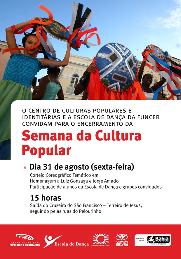 Pelo sexto ano, crianças e jovens alunos da Escola de Dança da FUNCEB realizam o tradicional cortejo em reverência à Cultura Popular, nesta sexta-feira, 31 de agosto. Com concentração no Cruzeiro do São Francisco, às 14h30, a caminhada, que agrega também grupos artísticos convidados, inicia seu percurso às 15 horas, a partir do Terreiro de Jesus, numa colorida e coreográfica ocupação do Centro Histórico de Salvador. O cortejo vai levar para as ruas personagens criados por Jorge Amado, misturados a sanfoneiros e retirantes da seca, em menção à obra de Luiz Gonzaga. Também não irão faltar samba, xaxado, capoeira e outras danças populares brasileiras. A ação encerra a 2ª edição da Semana da Cultura Popular, iniciativa do Centro de Culturas Populares e Identitárias (CCPI/SecultBA), que promove uma programação especial e totalmente gratuita no Pelourinho entre os dias 28 e 31 de agosto. Este ano, o evento homenageia o centenário de nascimento de Jorge Amado e Luiz Gonzaga, tendo como tema a riqueza e a diversidade cultural da Bahia. Integrando as atrações, estarão manifestações populares de linguagens distintas, diálogos interculturais, palestra, apresentações de música e dança, exibições de filmes, entre outras, tendo o cortejo coreográfico como momento final. “É importante comemorar a sabedoria popular. O cortejo é uma das formas de chamar a atenção da população para a necessidade de valorizar esta cultura. Na Escola de Dança da FUNCEB, as crianças, desde os cinco anos de idade, até os adultos alunos aprendem sobre cultura popular, conteúdo que faz parte das disciplinas aplicadas na instituição”, explica Clécia Queiroz, coordenadora do Curso Preparatório da Escola. A participação dos alunos da Escola de Dança da FUNCEB neste cortejo é uma prática que se alinha à Lei 10.639/2003, que torna obrigatória a inclusão de História e Cultura Afro-brasileira nos currículos escolares. Os cursos preparatórios e profissionalizantes da instituição estão atualizados com esta exigência, tendo em suas grades disciplinas como Danças Afro-brasileiras, Danças Populares e Capoeira. A Escola de Dança da FUNCEB constituiu-se como a primeira escola pública do gênero no país, e integra o Centro de Formação em Artes (CFA) da Fundação Cultural do Estado da Bahia (FUNCEB), vinculada da Secretaria de Cultura do Governo do Estado da Bahia (SecultBA). Com sede no Pelourinho, no Centro Histórico de Salvador, capital da Bahia, a instituição reflete a identidade cultural do estado, reconhecendo, valorizando e disseminando suas origens e diversidade, na perspectiva de uma educação integral, democrática e cidadã. Cortejo de encerramento da Semana da Cultura Popular Quando: 31 de agosto: concentração às 14h30; saída às 15 horas Onde: Pelourinho – Centro Histórico de Salvador Concentração no Cruzeiro do São Francisco. Percurso a partir do Terreiro de Jesus, passando pela Rua Alfredo de Brito e Largo do Pelourinho, e finalizando na Rua Gregório de Mattos. Quanto: Gratuito Informações: 71 3116-6644 Realização: CCPI/ Escola de Dança da FUNCEB/ CFA/ FUNCEB/ SecultBA