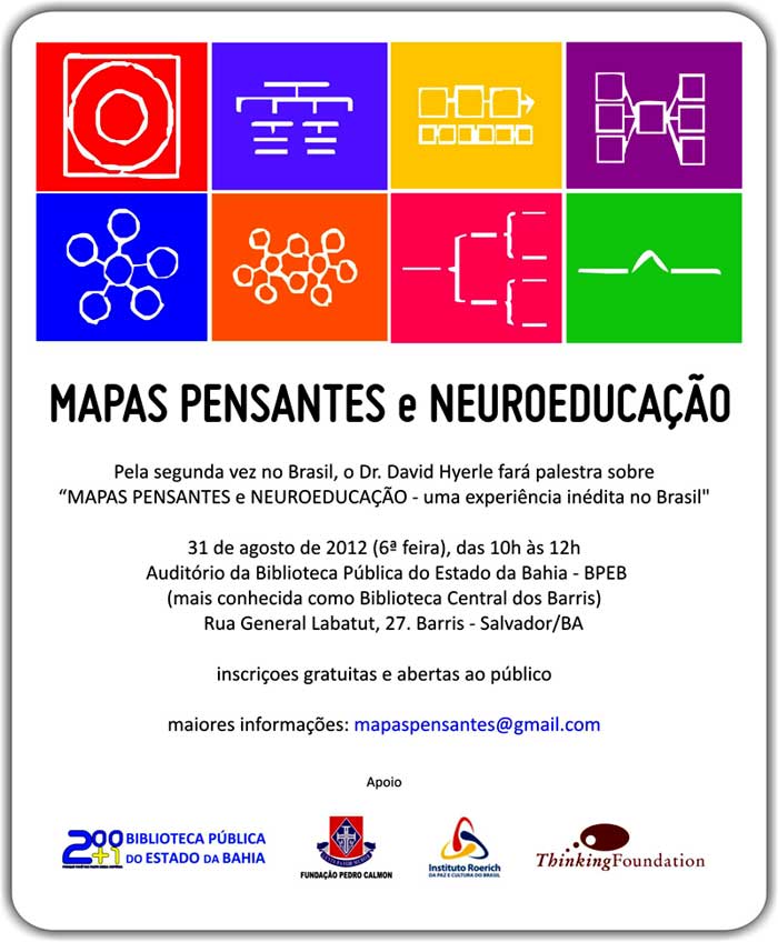 Nesta sexta-feira (31), às 10h, acontece na Biblioteca a palestra "Mapas Pensantes e Neuroeducação – uma experiência pioneira no Brasil". O evento, promovido pelo Instituto Roerich, é gratuito, inédito em Salvador e vai ser conduzido pelo Prof. Dr. David Hyerle, criador dos Thinkings Maps (Mapas Pensantes), uma nova linguagem visual de ensino comum e interativa que busca potencializar as habilidades dos pensamentos dos estudantes.