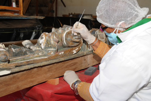 “São duas peças entalhadas em madeira umburana, com 17 m², sendo 6,5 cm de altura por 2,65 cm de largura, que têm mérito excepcional pela originalidade”, explica a coordenadora de Restauro de Elementos Artísticos (Cores) do IPAC, Milena Tavares. Segundo ela, o atual desenho na talha em madeira foi pintado grotescamente, mas a pintura original, de cerca de 250 anos, se revelou graças ao trabalho criterioso da equipe de restauro do IPAC.