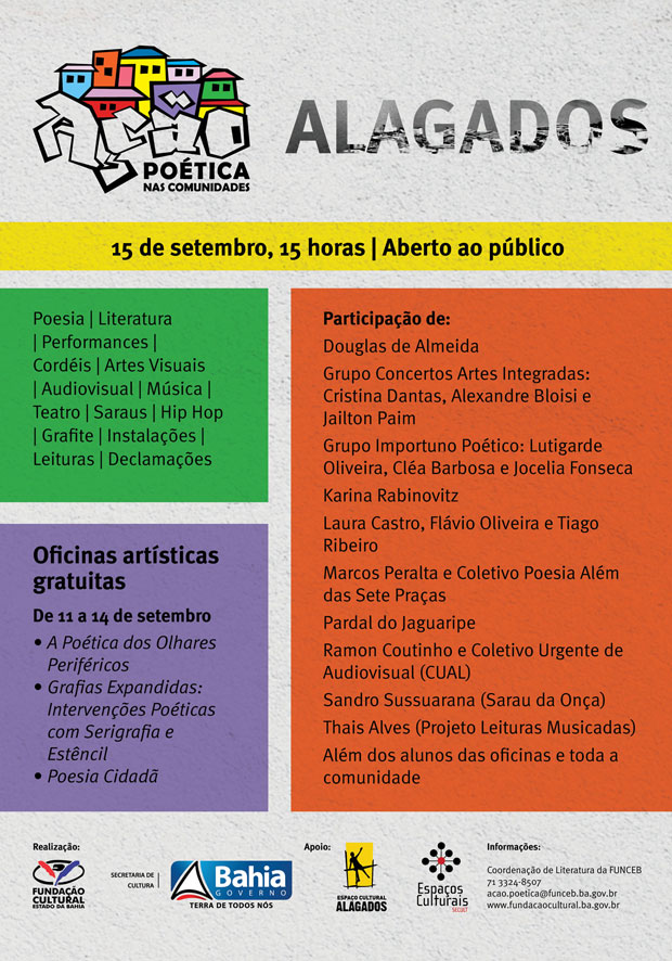 Levando a poesia, em sua diversidade de estilos e abordagens, a comunidades populares, o Ação Poética nas Comunidades chega à região de Alagados, em Salvador, entre os dias 11 e 15 de setembro. Iniciativa da Fundação Cultural do Estado da Bahia (FUNCEB), vinculada da Secretaria de Cultura do Estado (SecultBA), em parceria com a Superintendência de Desenvolvimento Territorial da Cultura (Sudecult), através da Diretoria de Espaços Culturais e o Espaço Cultural Alagados, o projeto, em seus primeiros quatro dias (11 a 14 de setembro, terça a sexta), vai promover oficinas artísticas gratuitas para crianças, jovens e adultos, culminando, na última data (15 de setembro, sábado, a partir das 15 horas), numa grande ação de intervenção artística e social aberta ao público. Junto aos moradores e amigos da comunidade de Alagados, 10 artistas/coletivos, atuantes nas áreas literárias, poéticas ou na interação delas com outras linguagens artísticas, participam desta 2ª edição do projeto. Eles vão mostrar, através de seus trabalhos, possibilidades do uso da palavra em diversas expressões das artes, explorando a interdisciplinaridade da poesia e as suas inúmeras potencialidades. Assim, a palavra poética extrapola os espaços canônicos e invade o ambiente urbano, deixando-o mais colorido, mais leve e mais humano. Todos os profissionais que vão fazer parte do Ação Poética em Alagados foram selecionados através de Chamada Pública realizada pela FUNCEB, que atraiu 132 inscritos. Conforme as vagas disponibilizadas, três artistas/coletivos foram selecionados para promover oficinas, além de para participar da intervenção final: Ramon Coutinho, com apoio do Coletivo Urgente de Audiovisual (CUAL); Laura Castro, Flávio Oliveira e Tiago Ribeiro; e Douglas de Almeida. Eles vão trabalhar interlocuções da poesia com o audiovisual, as artes visuais e o teatro, em cursos com carga horária de 12 horas. Os resultados das oficinas serão apresentados na ação poética do dia 15 de setembro, reunindo, além dos alunos e professores, os sete outros artistas/coletivos: Grupo Concertos Artes Integradas (Cristina Dantas, Alexandre Bloisi e Jailton Paim); Grupo Importuno Poético (Lutigarde Oliveira, Cléa Barbosa e Jocelia Fonseca); Karina Rabinovitz; Marcos Peralta e Coletivo Poesia Além das Sete Praças; Pardal do Jaguaripe; Sandro Sussuarana (Sarau da Onça); e Thais Alves (Projeto Leituras Musicadas). O Ação Poética nas Comunidades estreou em 25 de março passado, na comunidade do Solar do Unhão, na Avenida Contorno, em edição-piloto. A sua proposta é de contribuir para amenizar carências socioculturais, intervindo em locais que apresentem tensão social, problemas de violência e escassez de bens culturais, proporcionando um tempo e um espaço para a reflexão. As oficinas do Ação Poética em Alagados Na turma de A Poética dos Olhares Periféricos, com 20 vagas para jovens e adultos, a relação entre poesia e audiovisual será trabalhada em aulas teóricas e atividades práticas, para produção de vídeos documentais que revelem as narrativas poéticas existentes na periferia de Salvador. As aulas, ministradas por Ramon Coutinho com apoio do Coletivo Urgente de Audiovisual (CUAL), acontecerão das 14 às 17 horas. Em Grafias Expandidas: Intervenções Poéticas com Serigrafia e Estêncil, com os facilitadores Laura Castro, Flávio Oliveira e Tiago Ribeiro, literatura e artes visuais se encontram. São 25 vagas para jovens e adultos interessados na experimentação do elemento visual da palavra para uso das técnicas de serigrafia e de estêncil a fim de criar objetos literários, desde o livro até intervenções poéticas. As aulas são também das 14 às 17 horas. Já a criançada participa da oficina Poesia Cidadã, voltada para 20 meninos e meninas dos 8 aos 12 anos, com aulas das 9 às 12 horas. O ministrante Douglas de Almeida propõe unir poesia e teatro através da leitura e discussão de cordéis e poemas de escritores como Castro Alves, Cecília Meireles, Sérgio Vaz e Damário Dacruz, com jogos, dinâmicas e exercícios para criação de uma performance poético-teatral. Ação Poética em Alagados Onde: Espaço Cultural Alagados e região Oficinas: 11 a 14 de setembro (terça a sexta) Ação Poética: 15 de setembro (sábado), 15h Quanto: Grátis Informações: Coordenação de Literatura da FUNCEB 71 3324-8507 acao.poetica@funceb.ba.gov.br www.fundacaocultural.ba.gov.br Realização: FUNCEB/ SecultBA Apoio: Espaço Cultural Alagados/ DEC/ Sudecult Oficinas A Poética dos Olhares Periféricos Ministrante: Ramon Coutinho, com apoio do Coletivo Urgente de Audiovisual (CUAL) Público-alvo: Jovens e adultos (20 vagas) Horário das aulas: 14h às 17h Grafias Expandidas: Intervenções Poéticas com Serigrafia e Estêncil Ministrantes: Laura Castro, Flávio Oliveira e Tiago Ribeiro Público-alvo: Jovens e adultos (25 vagas) Horário das aulas: 14h às 17h Oficina Poesia Cidadã Ministrante: Douglas de Almeida Público-alvo: Crianças de 8 a 12 anos (20 vagas) Horário das aulas: 9h às 12h